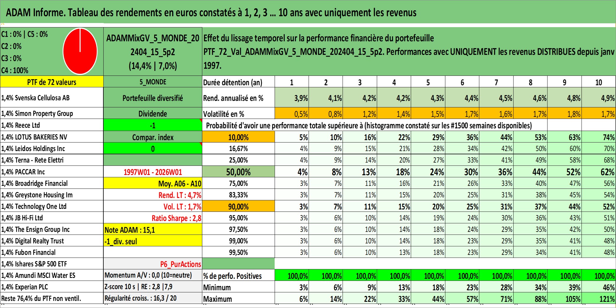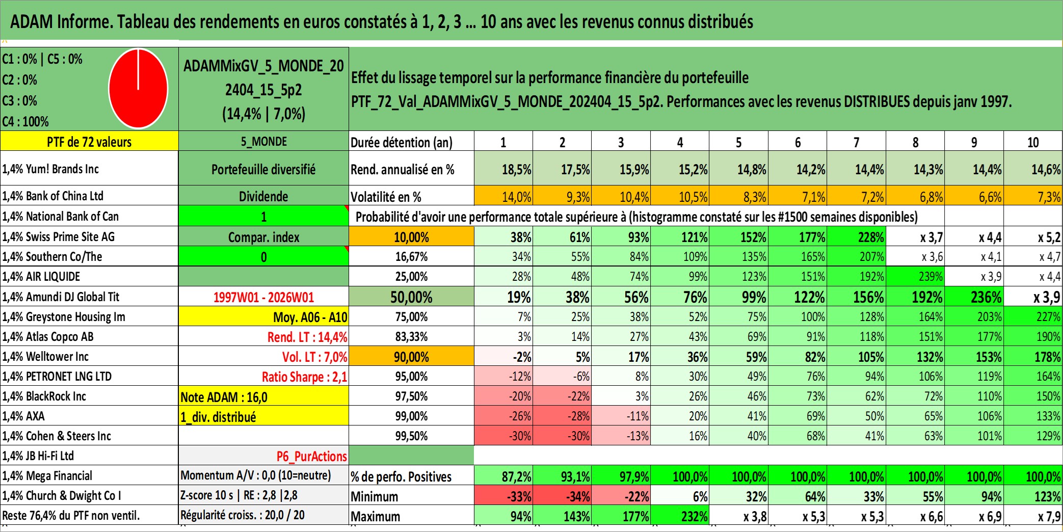 Site dédié aux investisseursPage dédiée sur site financeAnalyse des valorisations hebdomadaires du portefeuille ADAMMixGV_5_MONDE_202404_15_5p2_72actifs avec un profil P6_PurActions. Ce portefeuille est cote en EUR. Les valorisations couvrent les semaines 1997W01 a 2026W01. Les revenus de cet actif financier sont pris en compte depuis la semaine 1997W01. La note globale ESG de cet actif est estimee a 9.9 (apres rebasage entre 0 et 20).
