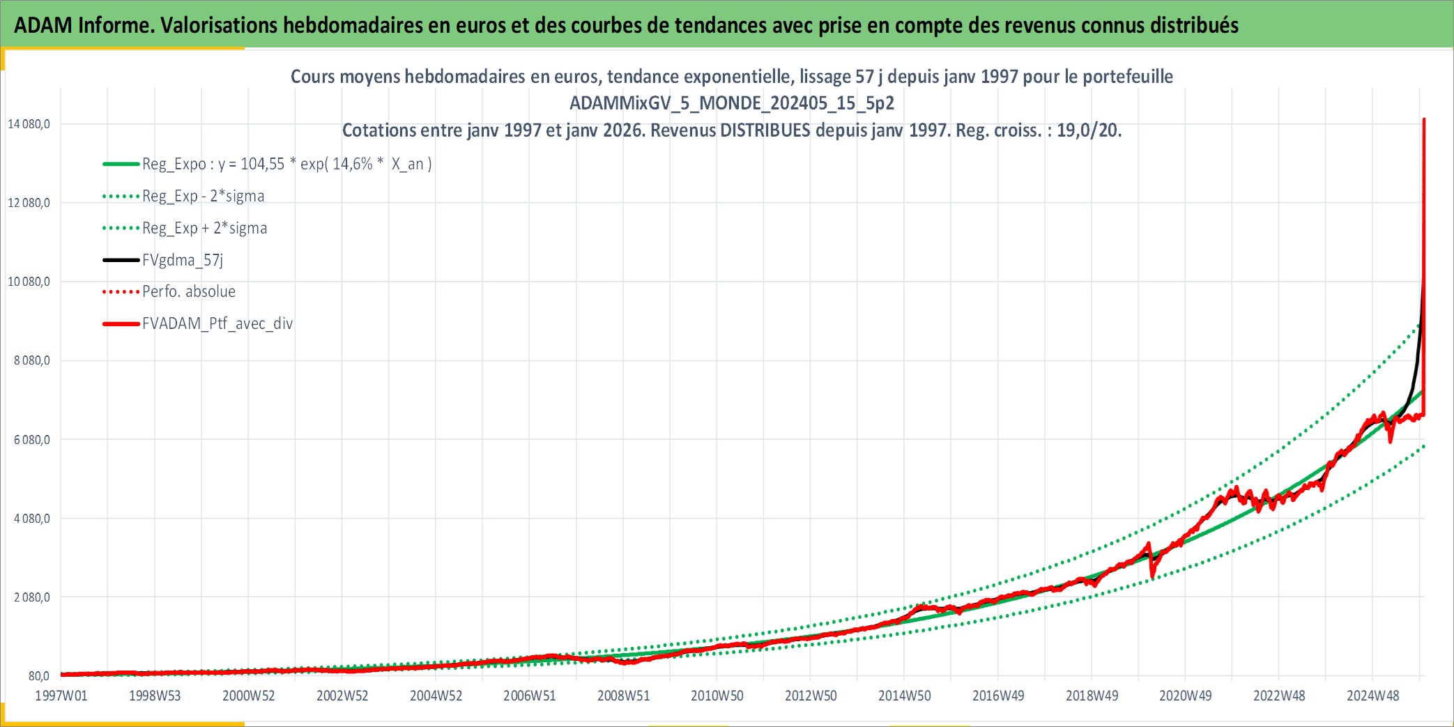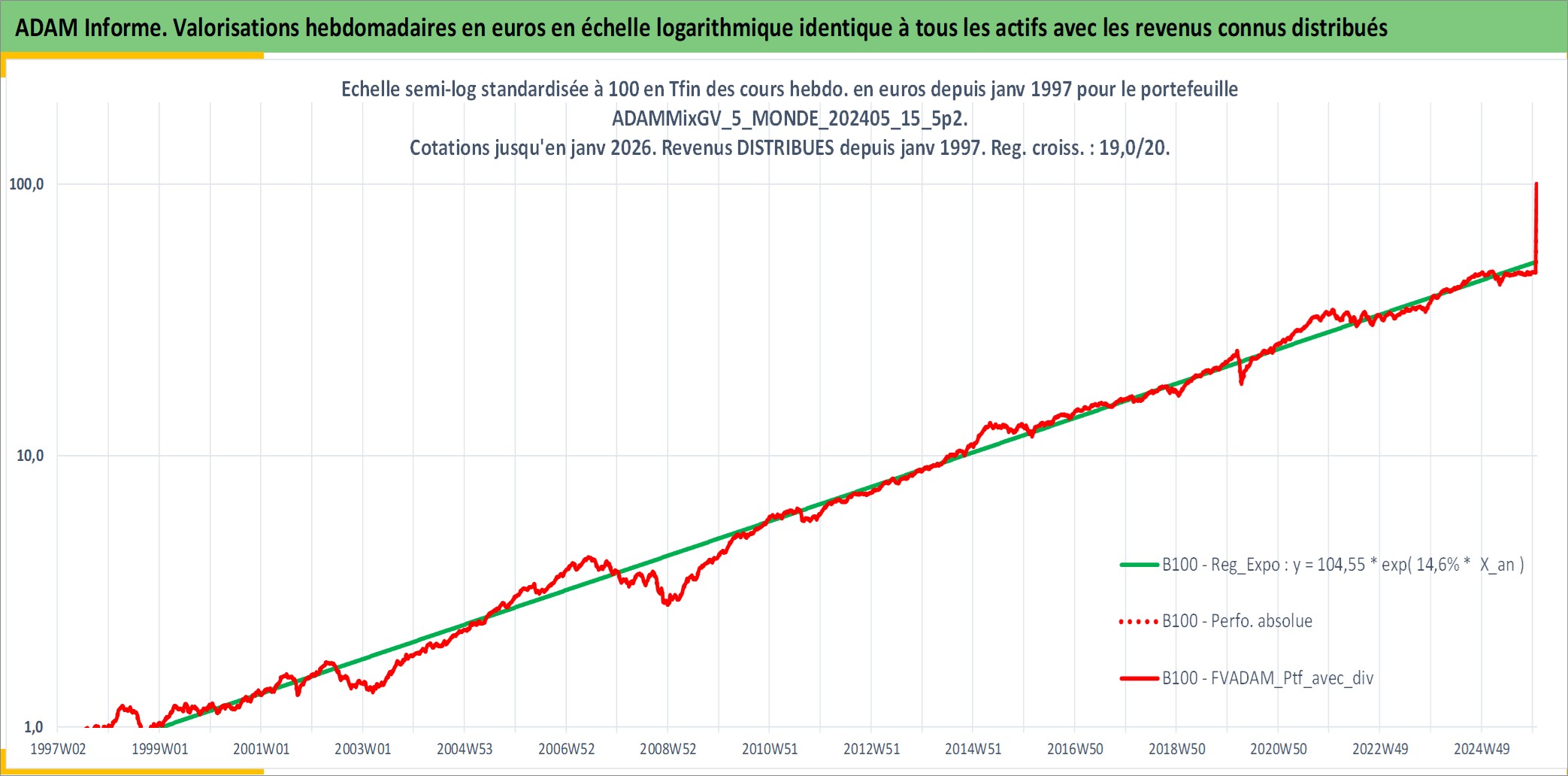 Site dédié aux investisseursPage dédiée sur site financeAnalyse des valorisations hebdomadaires du portefeuille ADAMMixGV_5_MONDE_202405_15_5p2_27actifs avec un profil P6_PurActions. Ce portefeuille est cote en EUR. Les valorisations couvrent les semaines 1997W01 a 2026W01. Les revenus de cet actif financier sont pris en compte depuis la semaine 1997W01. La note globale ESG de cet actif est estimee a 11.9 (apres rebasage entre 0 et 20).