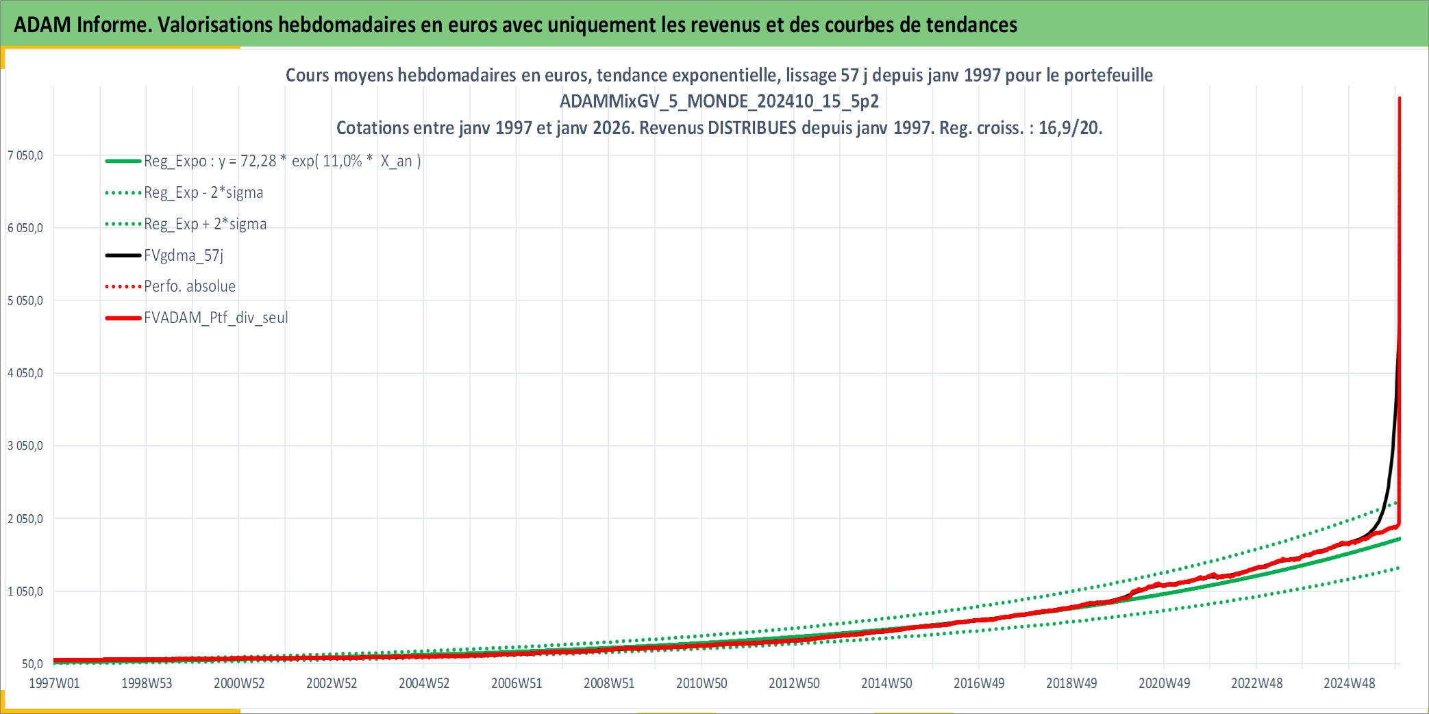 Site dédié aux investisseursPage dédiée sur site financeAnalyse des valorisations hebdomadaires du portefeuille ADAMMixGV_5_MONDE_202410_15_5p2_35actifs avec un profil P6_PurActions. Ce portefeuille est cote en EUR. Les valorisations couvrent les semaines 1997W01 a 2026W01. Les revenus de cet actif financier sont pris en compte depuis la semaine 1997W01. La note globale ESG de cet actif est estimee a 12.0 (apres rebasage entre 0 et 20).