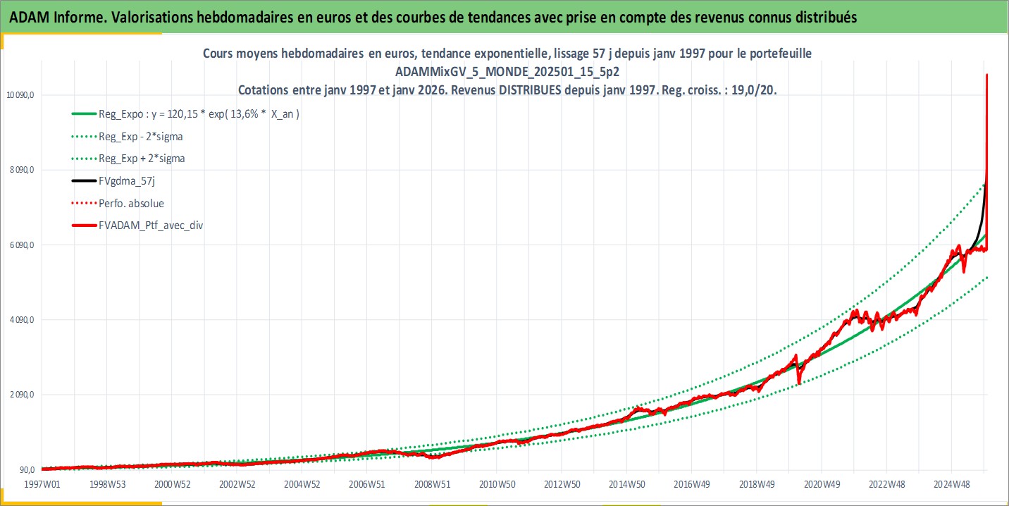 Site dédié aux investisseursPage dédiée sur site financeAnalyse des valorisations hebdomadaires du portefeuille ADAMMixGV_5_MONDE_202501_15_5p2_39actifs avec un profil P6_PurActions. Ce portefeuille est cote en EUR. Les valorisations couvrent les semaines 1997W01 a 2026W01. Les revenus de cet actif financier sont pris en compte depuis la semaine 1997W01. La note globale ESG de cet actif est estimee a 11.6 (apres rebasage entre 0 et 20).