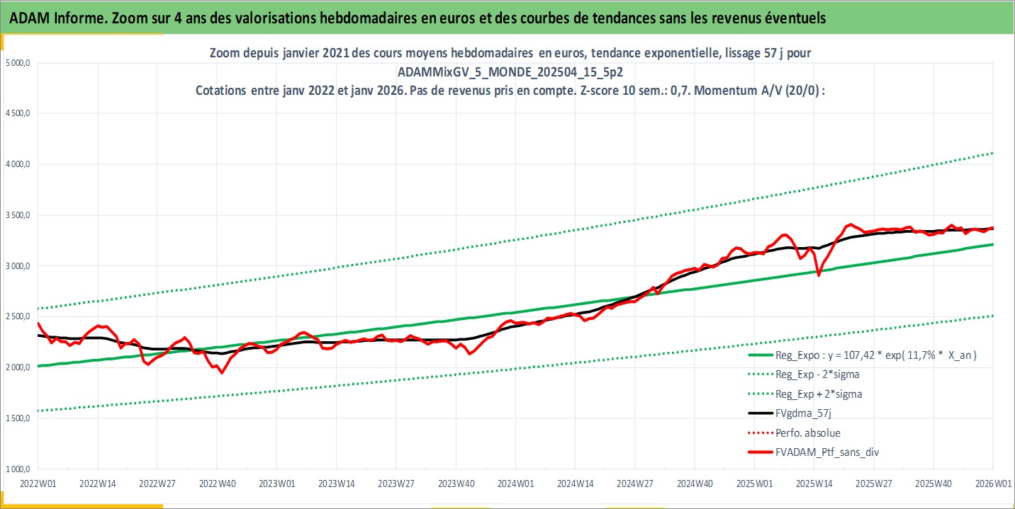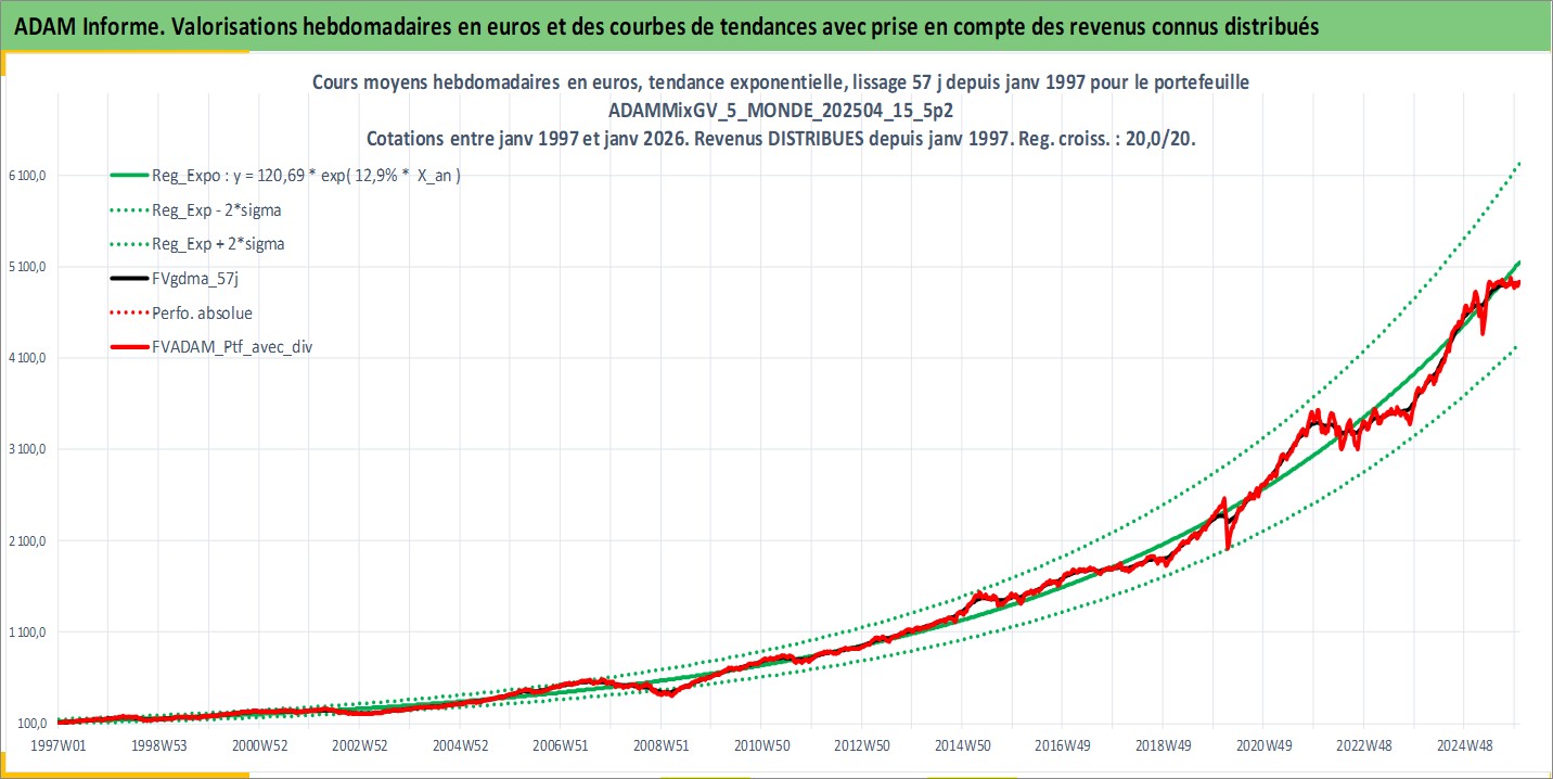 Site dédié aux investisseursPage dédiée sur site financeAnalyse des valorisations hebdomadaires du portefeuille ADAMMixGV_5_MONDE_202504_15_5p2_23actifs avec un profil P6_PurActions. Ce portefeuille est cote en EUR. Les valorisations couvrent les semaines 1997W01 a 2026W01. Les revenus de cet actif financier sont pris en compte depuis la semaine 1997W01. La note globale ESG de cet actif est estimee a 12.9 (apres rebasage entre 0 et 20).