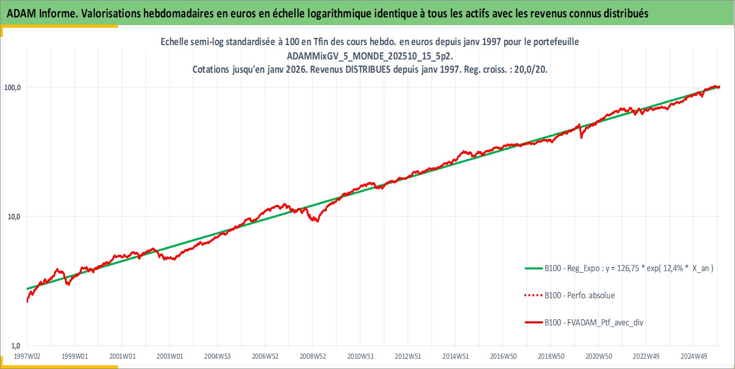 Site dédié aux investisseursPage dédiée sur site financeAnalyse des valorisations hebdomadaires du portefeuille ADAMMixGV_5_MONDE_202510_15_5p2_26actifs avec un profil P6_PurActions. Ce portefeuille est cote en EUR. Les valorisations couvrent les semaines 1997W01 a 2026W01. Les revenus de cet actif financier sont pris en compte depuis la semaine 1997W01. La note globale ESG de cet actif est estimee a 11.7 (apres rebasage entre 0 et 20).
