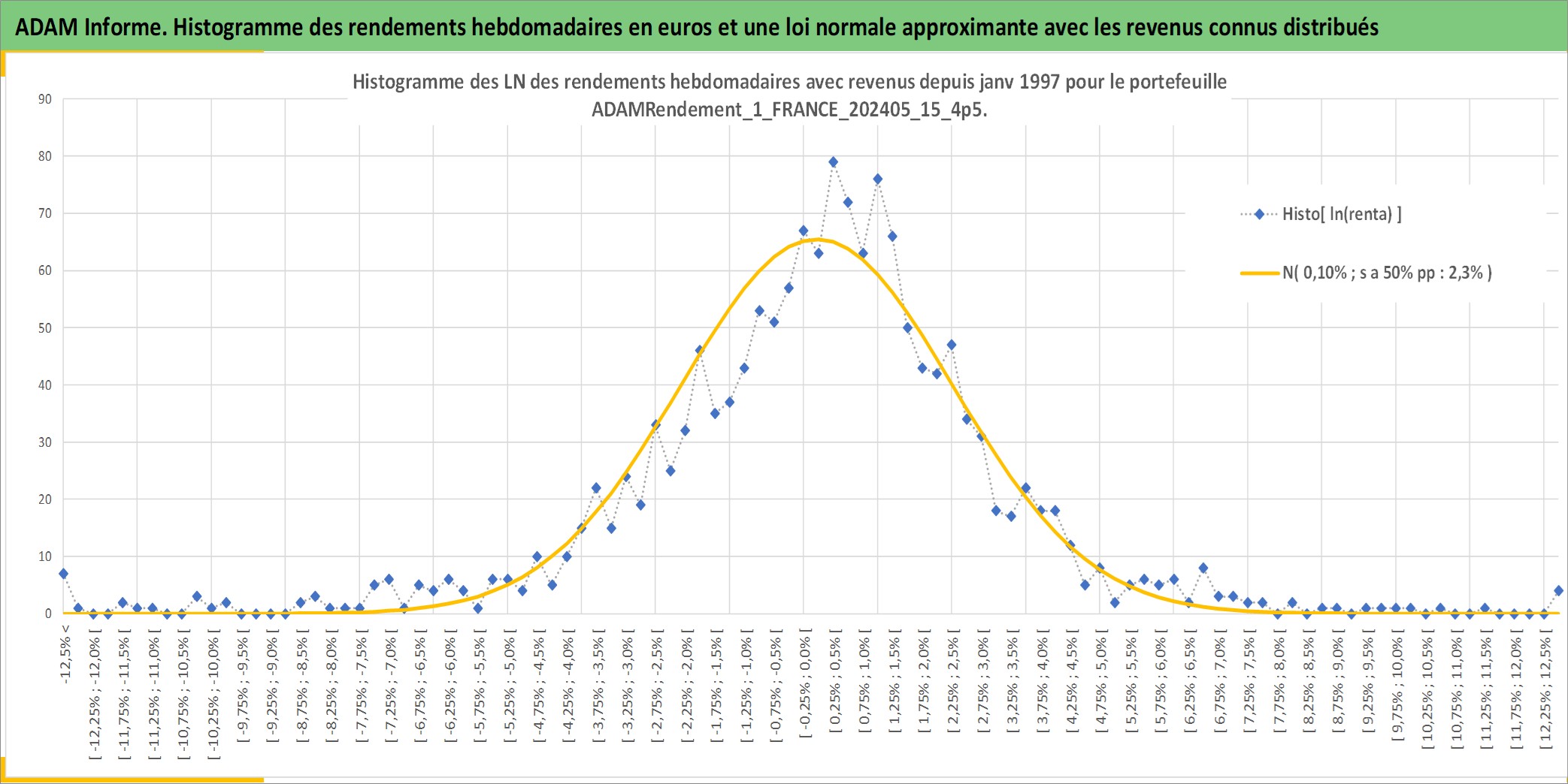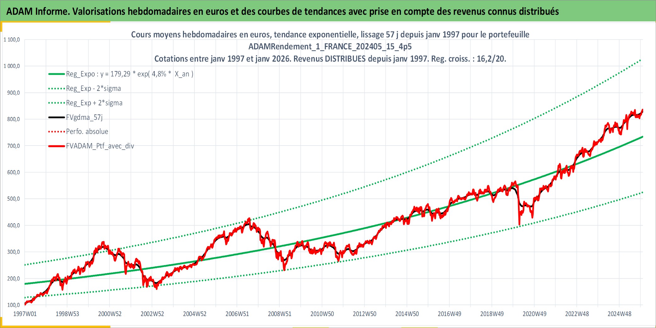 Site dédié aux investisseursPage dédiée sur site financeAnalyse des valorisations hebdomadaires du portefeuille ADAMRendement_1_FRANCE_202405_15_4p5_2actifs avec un profil P6_PurActions. Ce portefeuille est cote en EUR. Les valorisations couvrent les semaines 1997W01 a 2026W01. Les revenus de cet actif financier sont pris en compte depuis la semaine 1997W01. La note globale ESG de cet actif est estimee a 8.5 (apres rebasage entre 0 et 20).