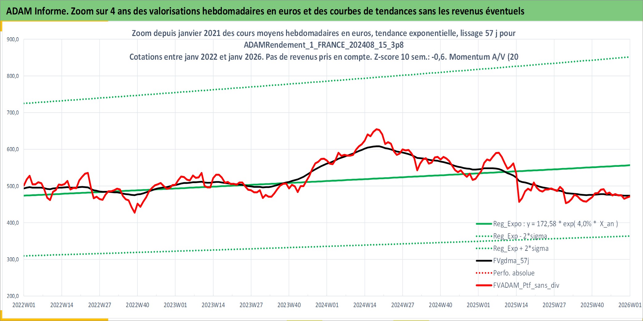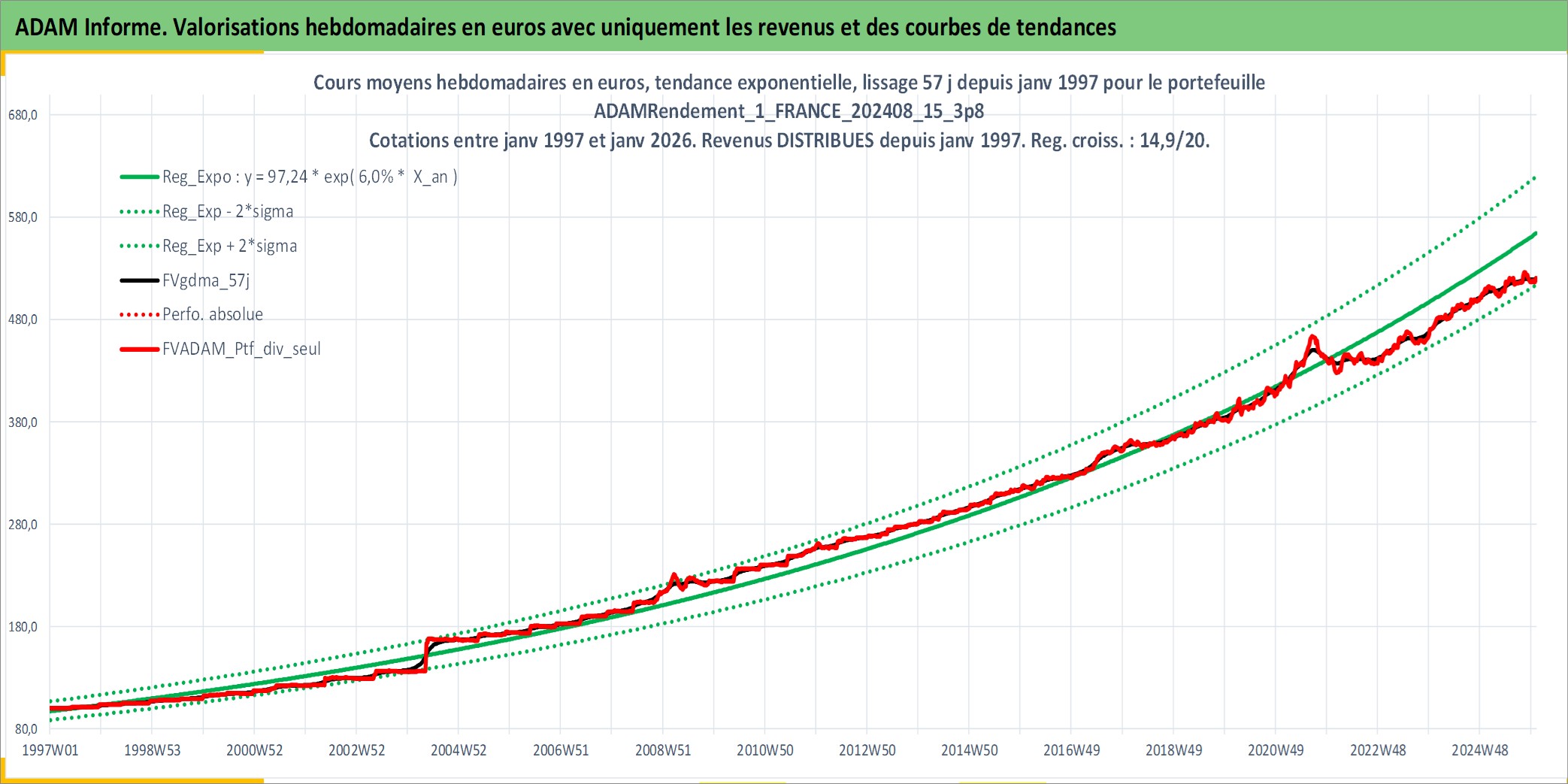 Site dédié aux investisseursPage dédiée sur site financeAnalyse des valorisations hebdomadaires du portefeuille ADAMRendement_1_FRANCE_202408_15_3p8_2actifs avec un profil P6_PurActions. Ce portefeuille est cote en EUR. Les valorisations couvrent les semaines 1997W01 a 2026W01. Les revenus de cet actif financier sont pris en compte depuis la semaine 1997W01. La note globale ESG de cet actif est estimee a 5.0 (apres rebasage entre 0 et 20).