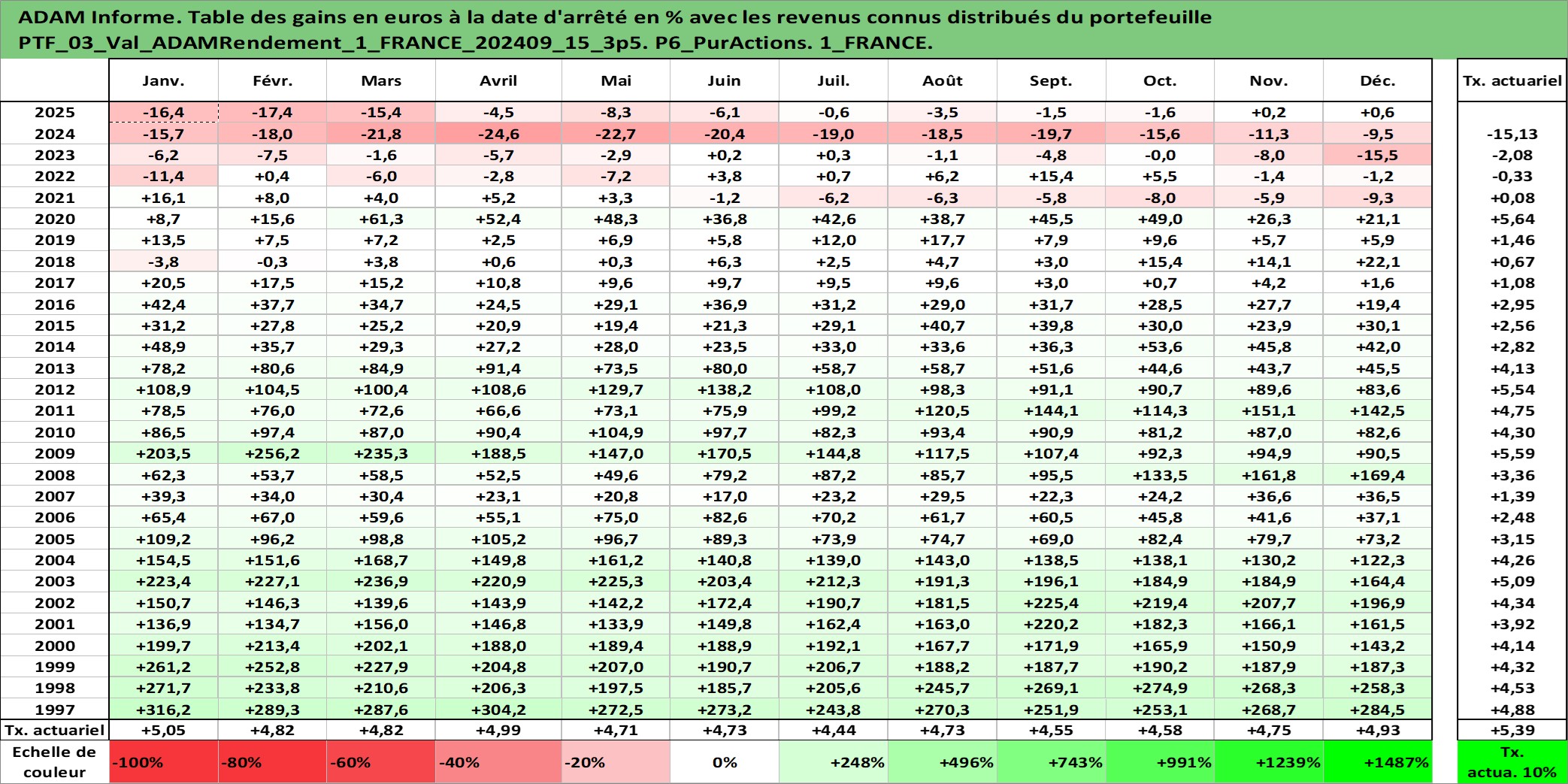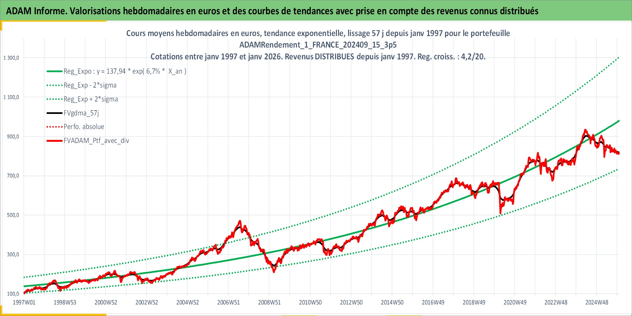 Site dédié aux investisseursPage dédiée sur site financeAnalyse des valorisations hebdomadaires du portefeuille ADAMRendement_1_FRANCE_202409_15_3p5_3actifs avec un profil P6_PurActions. Ce portefeuille est cote en EUR. Les valorisations couvrent les semaines 1997W01 a 2026W01. Les revenus de cet actif financier sont pris en compte depuis la semaine 1997W01. La note globale ESG de cet actif est estimee a 10.0 (apres rebasage entre 0 et 20).