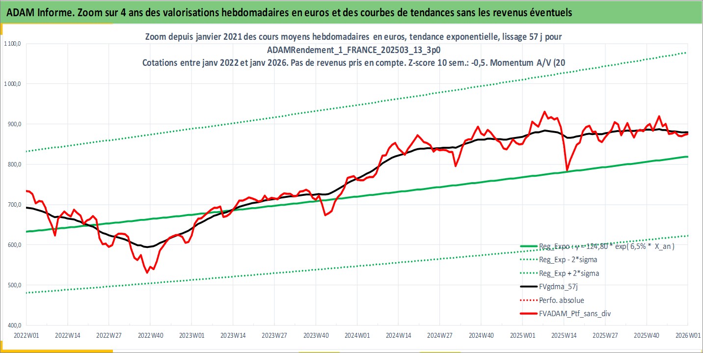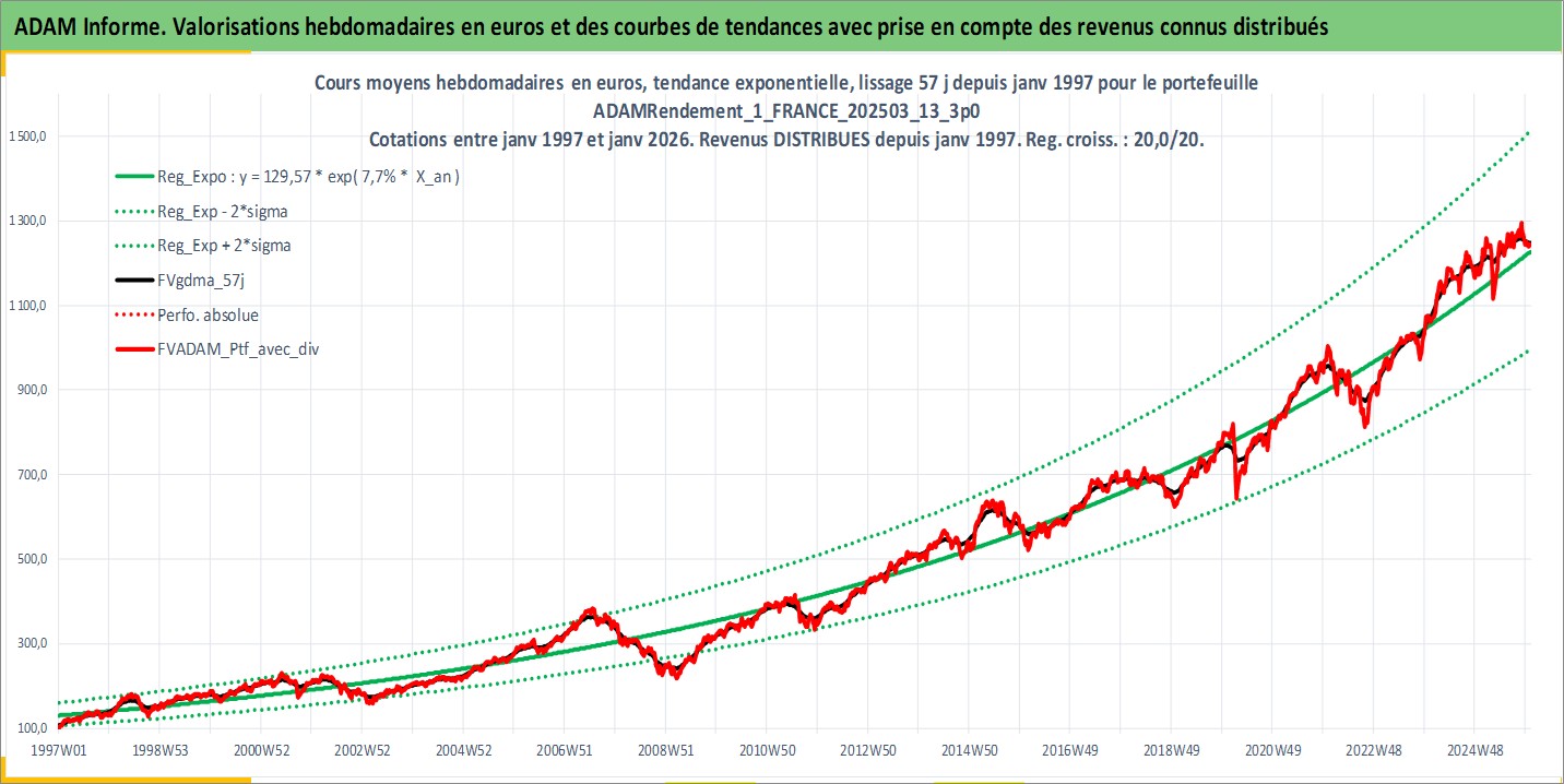Site dédié aux investisseursPage dédiée sur site financeAnalyse des valorisations hebdomadaires du portefeuille ADAMRendement_1_FRANCE_202503_13_3p0_6actifs avec un profil P6_PurActions. Ce portefeuille est cote en EUR. Les valorisations couvrent les semaines 1997W01 a 2026W01. Les revenus de cet actif financier sont pris en compte depuis la semaine 1997W01. La note globale ESG de cet actif est estimee a 12.0 (apres rebasage entre 0 et 20).