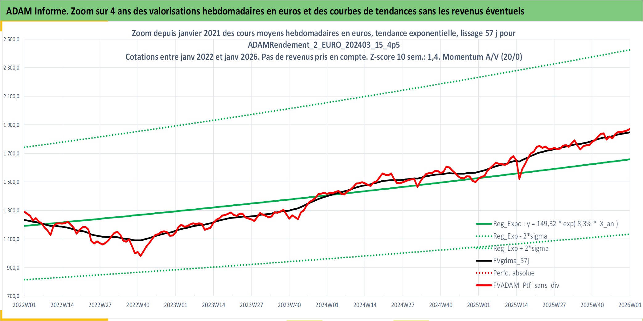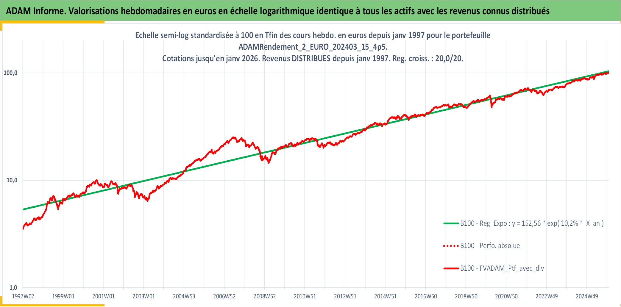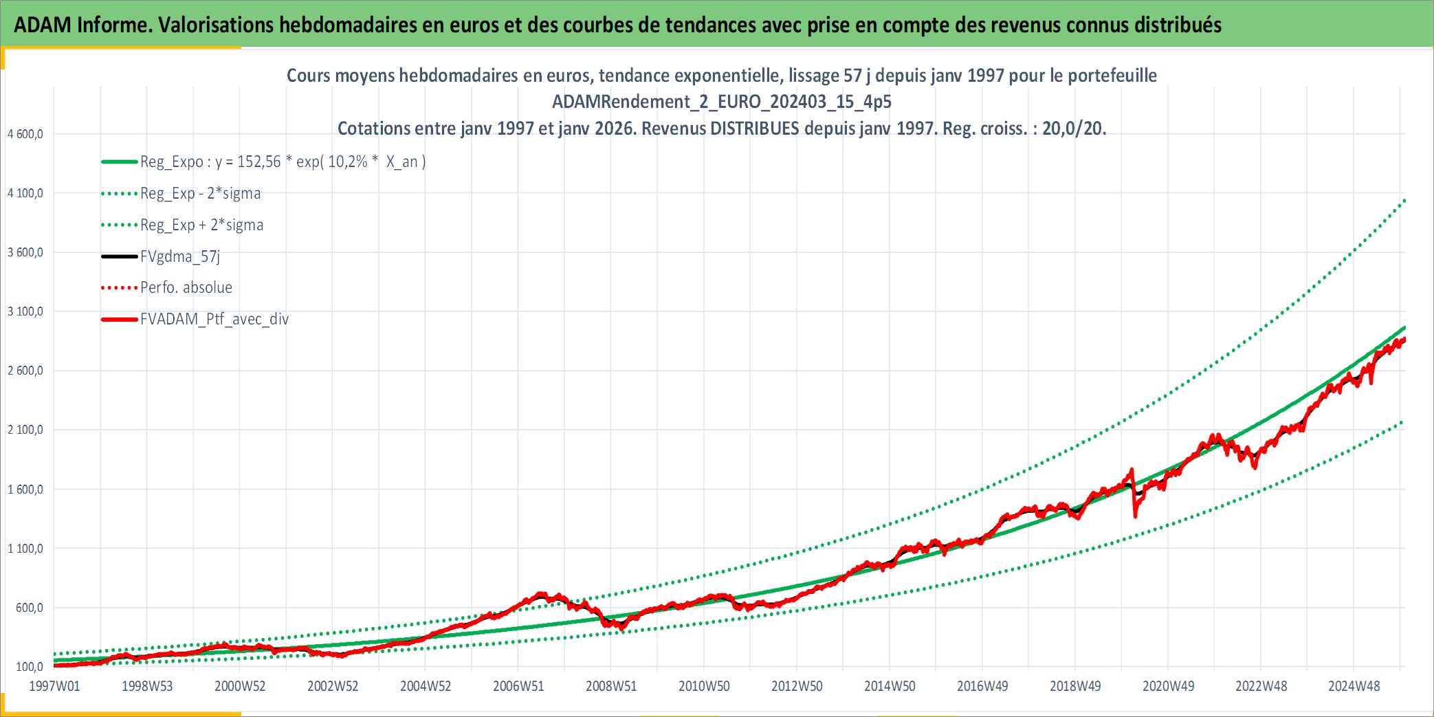 Site dédié aux investisseursPage dédiée sur site financeAnalyse des valorisations hebdomadaires du portefeuille ADAMRendement_2_EURO_202403_15_4p5_14actifs avec un profil P6_PurActions. Ce portefeuille est cote en EUR. Les valorisations couvrent les semaines 1997W01 a 2026W01. Les revenus de cet actif financier sont pris en compte depuis la semaine 1997W01. La note globale ESG de cet actif est estimee a 8.5 (apres rebasage entre 0 et 20).