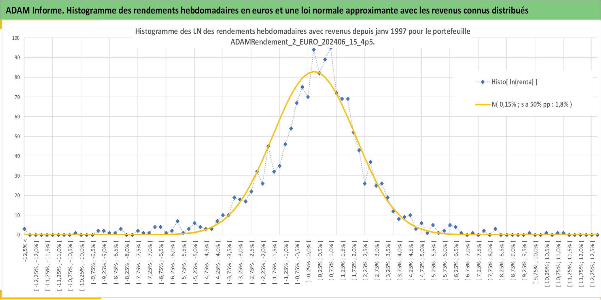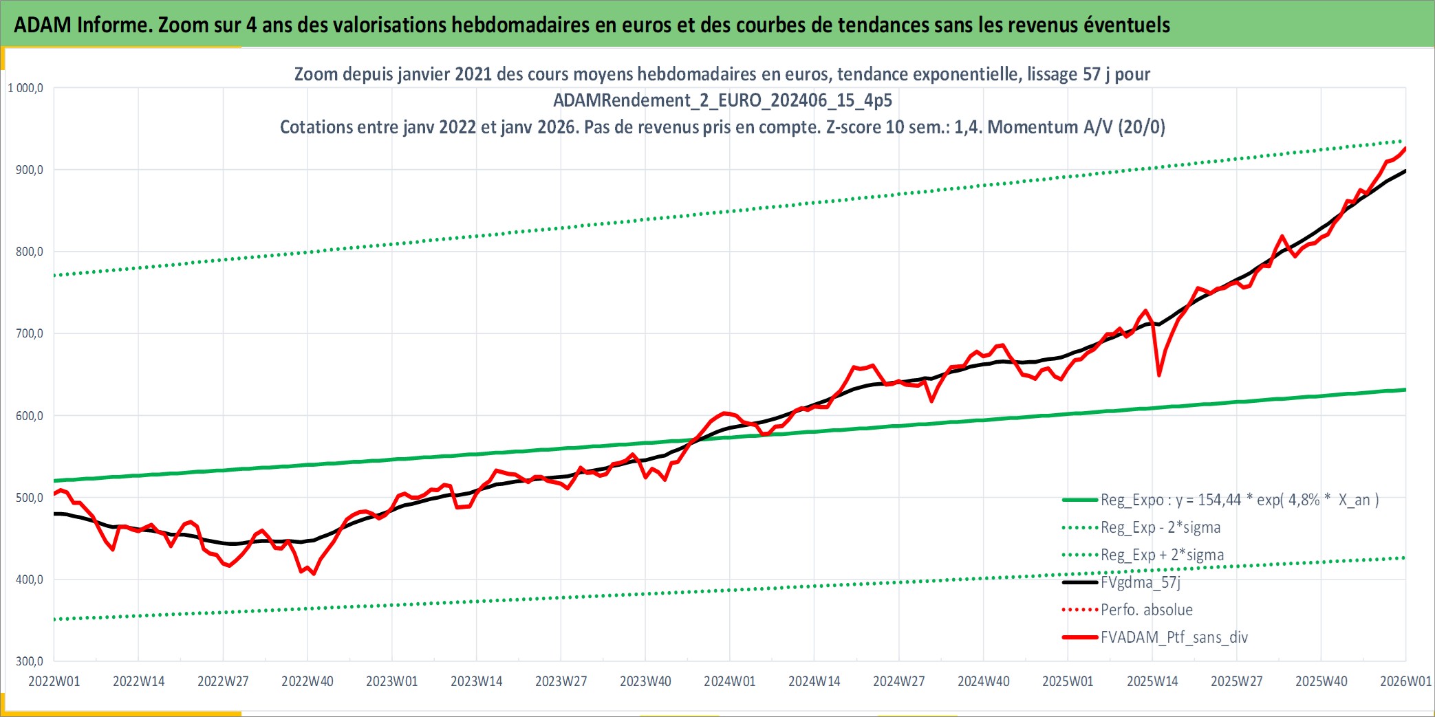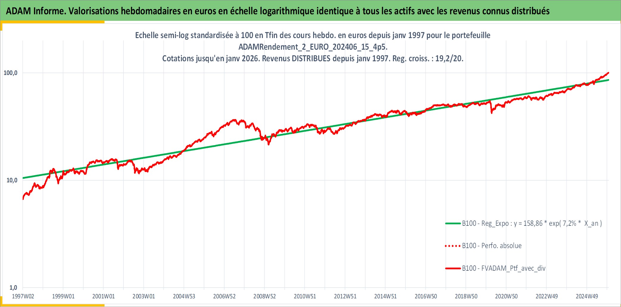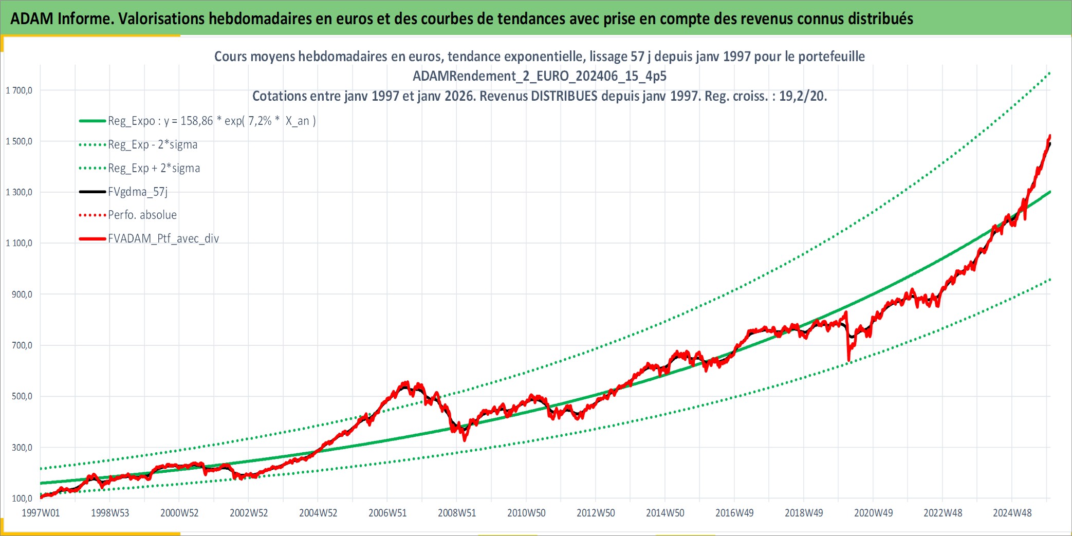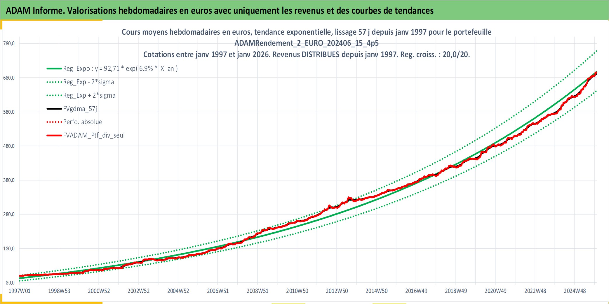 Site dédié aux investisseursPage dédiée sur site financeAnalyse des valorisations hebdomadaires du portefeuille ADAMRendement_2_EURO_202406_15_4p5_7actifs avec un profil P6_PurActions. Ce portefeuille est cote en EUR. Les valorisations couvrent les semaines 1997W01 a 2026W01. Les revenus de cet actif financier sont pris en compte depuis la semaine 1997W01. La note globale ESG de cet actif est estimee a 8.5 (apres rebasage entre 0 et 20).