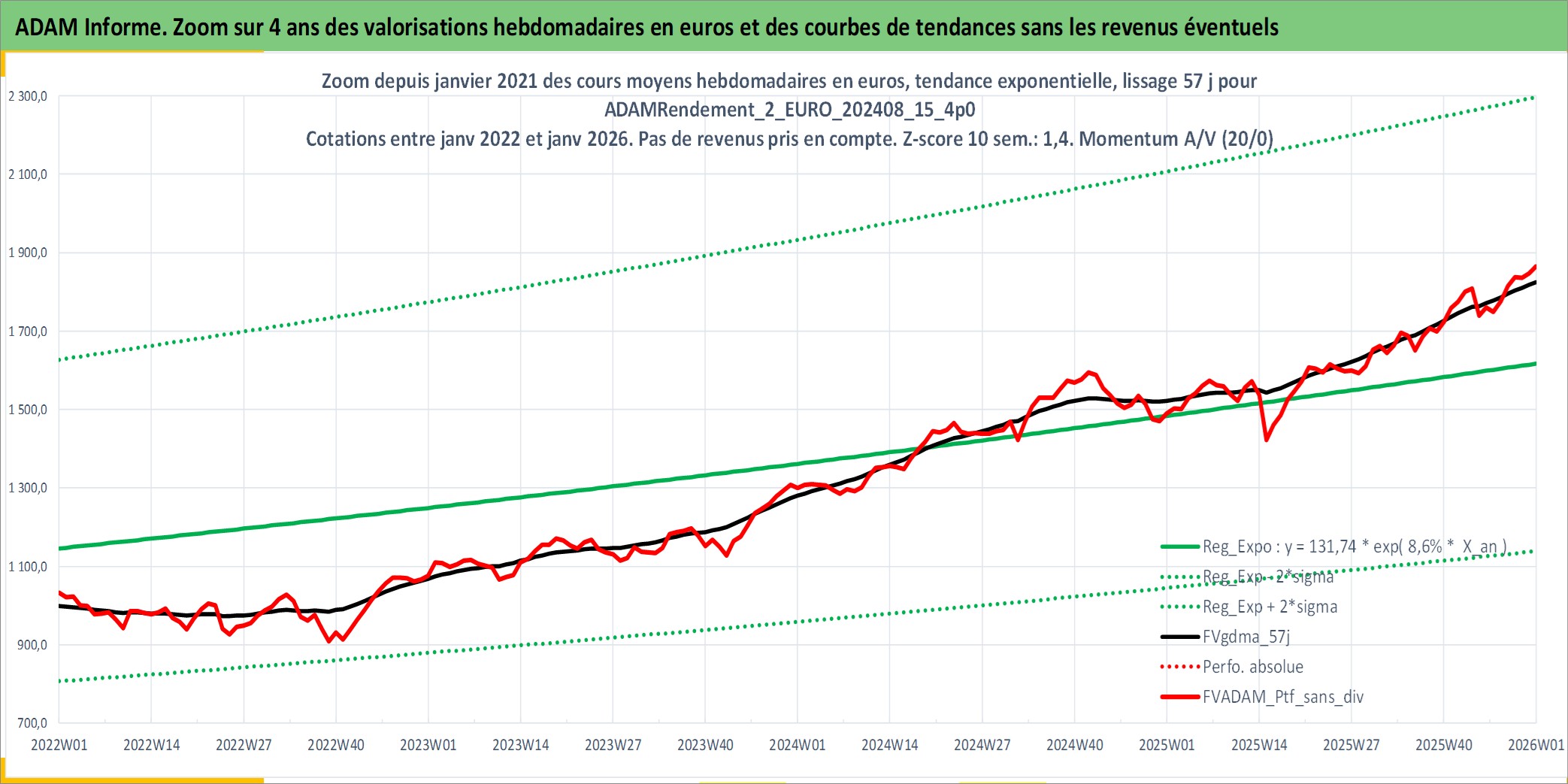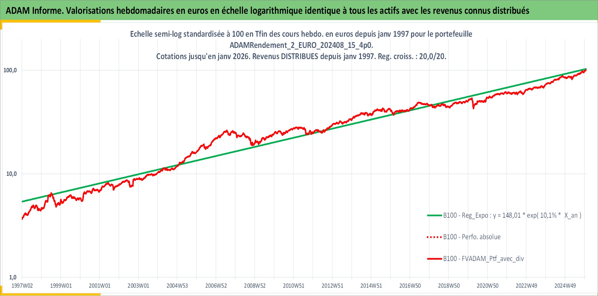Site dédié aux investisseursPage dédiée sur site financeAnalyse des valorisations hebdomadaires du portefeuille ADAMRendement_2_EURO_202408_15_4p0_8actifs avec un profil P6_PurActions. Ce portefeuille est cote en EUR. Les valorisations couvrent les semaines 1997W01 a 2026W01. Les revenus de cet actif financier sont pris en compte depuis la semaine 1997W01. La note globale ESG de cet actif est estimee a 10.3 (apres rebasage entre 0 et 20).