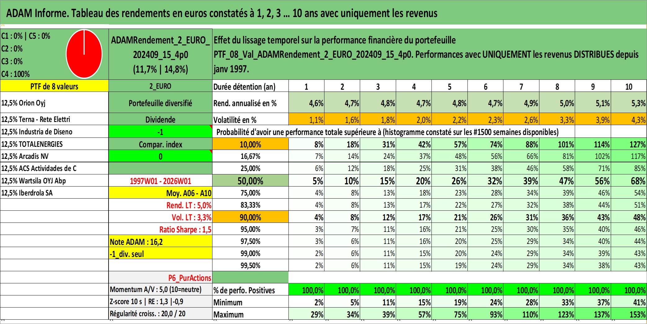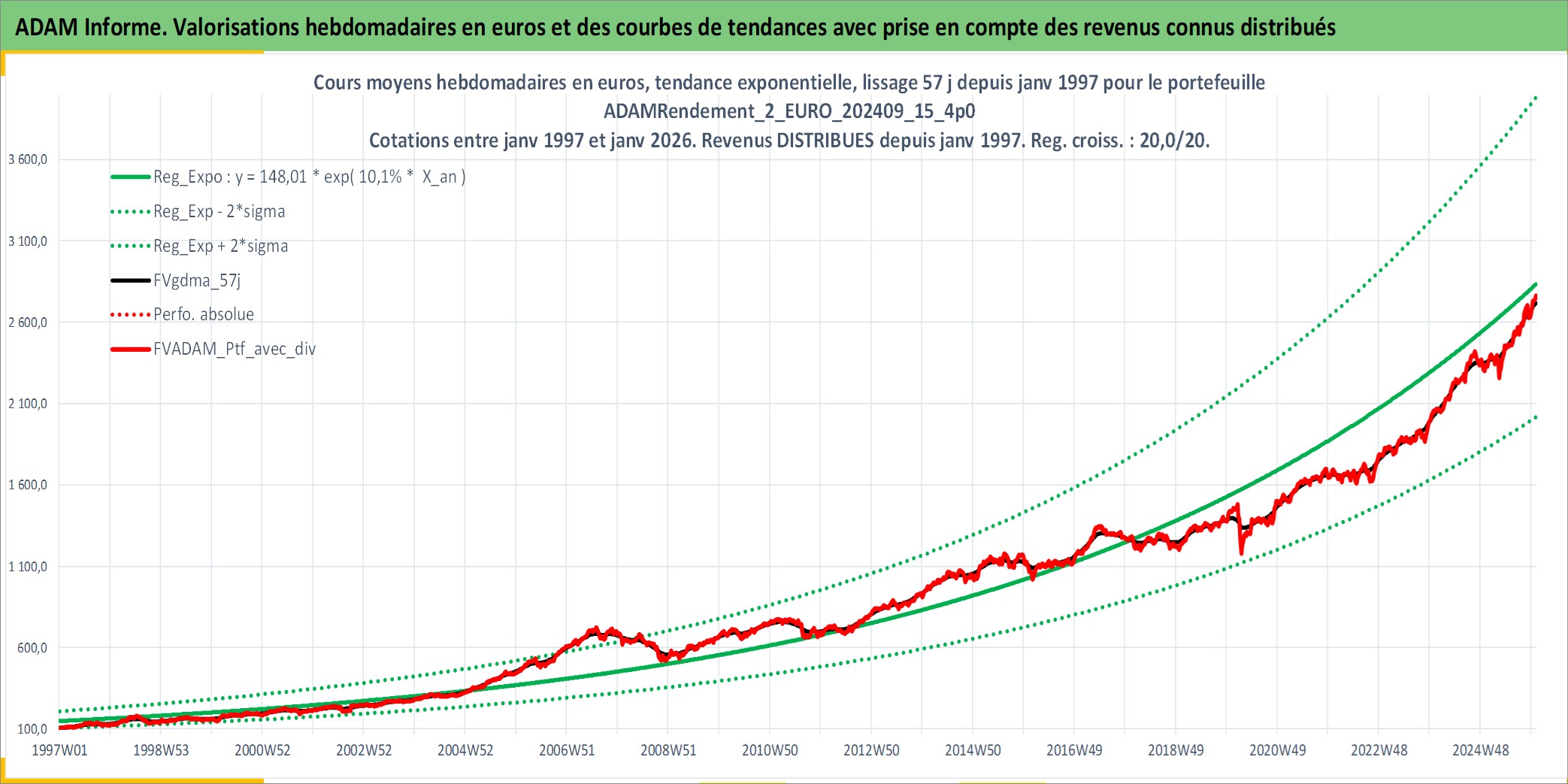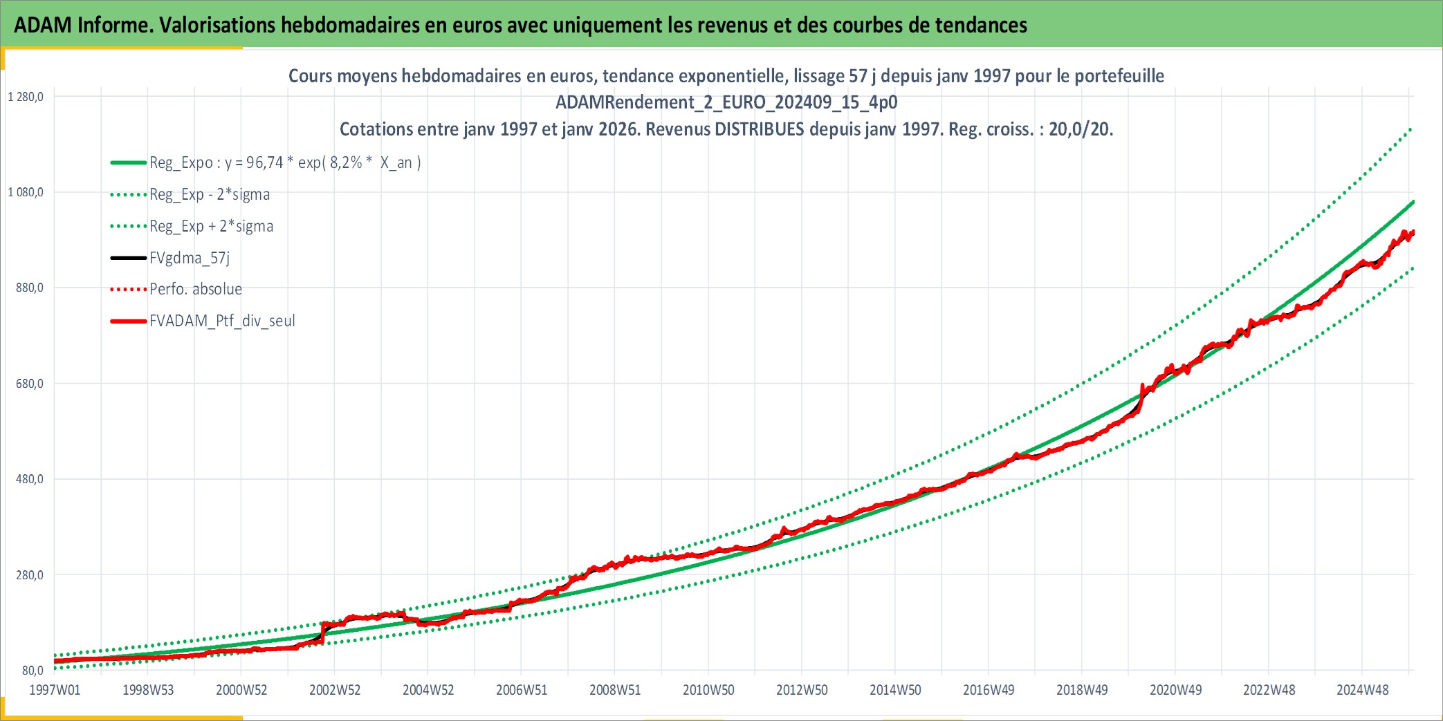 Site dédié aux investisseursPage dédiée sur site financeAnalyse des valorisations hebdomadaires du portefeuille ADAMRendement_2_EURO_202409_15_4p0_8actifs avec un profil P6_PurActions. Ce portefeuille est cote en EUR. Les valorisations couvrent les semaines 1997W01 a 2026W01. Les revenus de cet actif financier sont pris en compte depuis la semaine 1997W01. La note globale ESG de cet actif est estimee a 10.3 (apres rebasage entre 0 et 20).