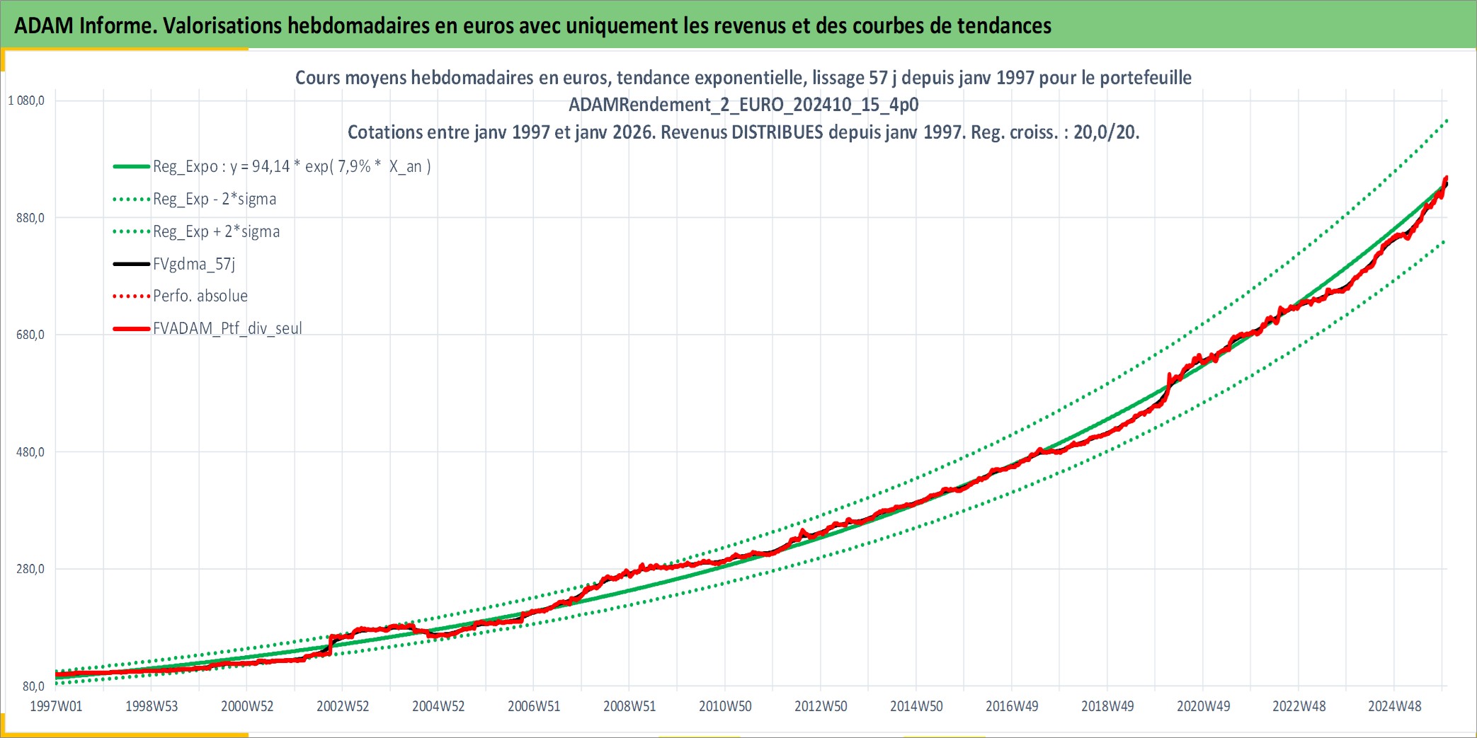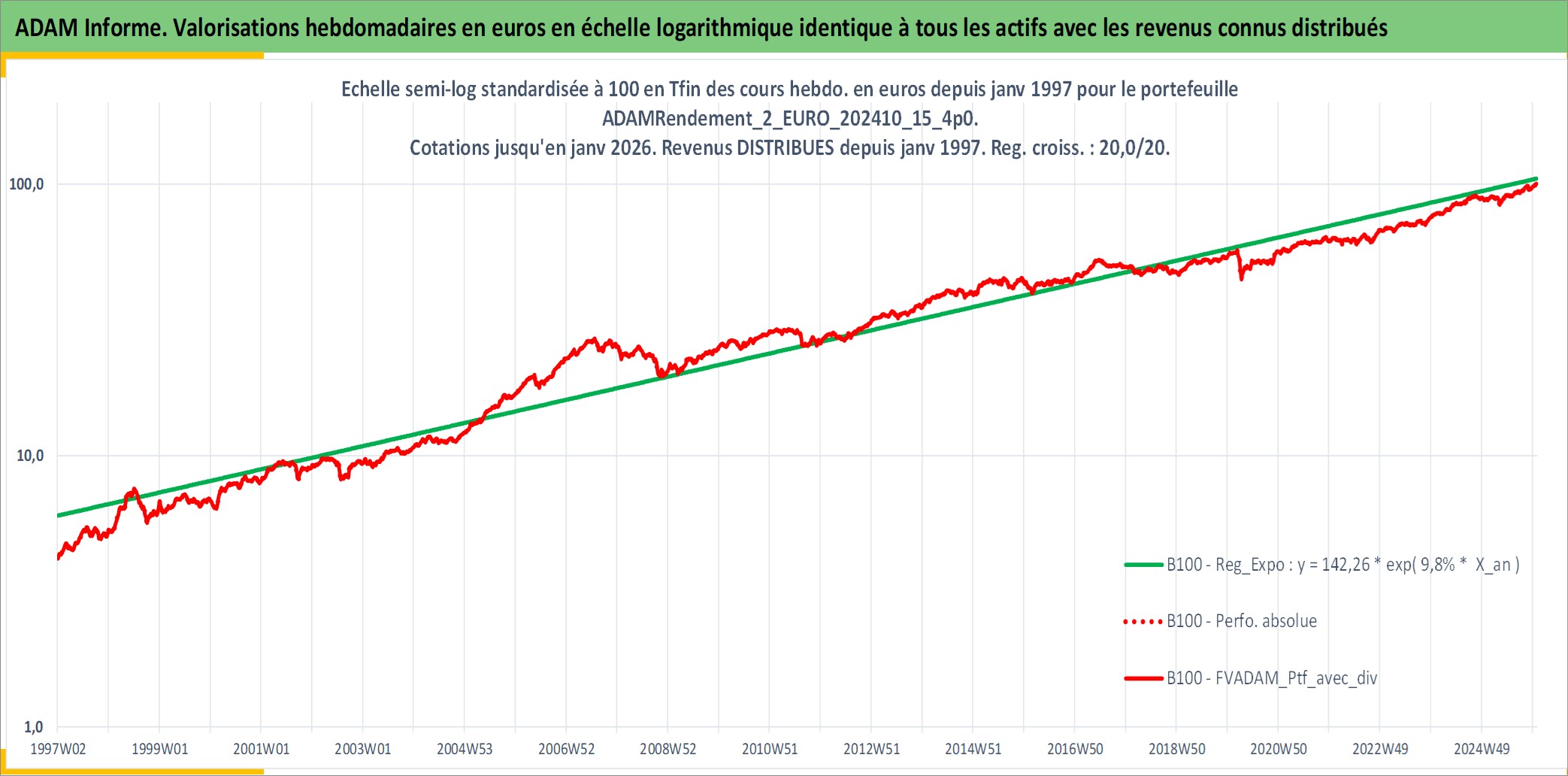 Site dédié aux investisseursPage dédiée sur site financeAnalyse des valorisations hebdomadaires du portefeuille ADAMRendement_2_EURO_202410_15_4p0_9actifs avec un profil P6_PurActions. Ce portefeuille est cote en EUR. Les valorisations couvrent les semaines 1997W01 a 2026W01. Les revenus de cet actif financier sont pris en compte depuis la semaine 1997W01. La note globale ESG de cet actif est estimee a 10.1 (apres rebasage entre 0 et 20).