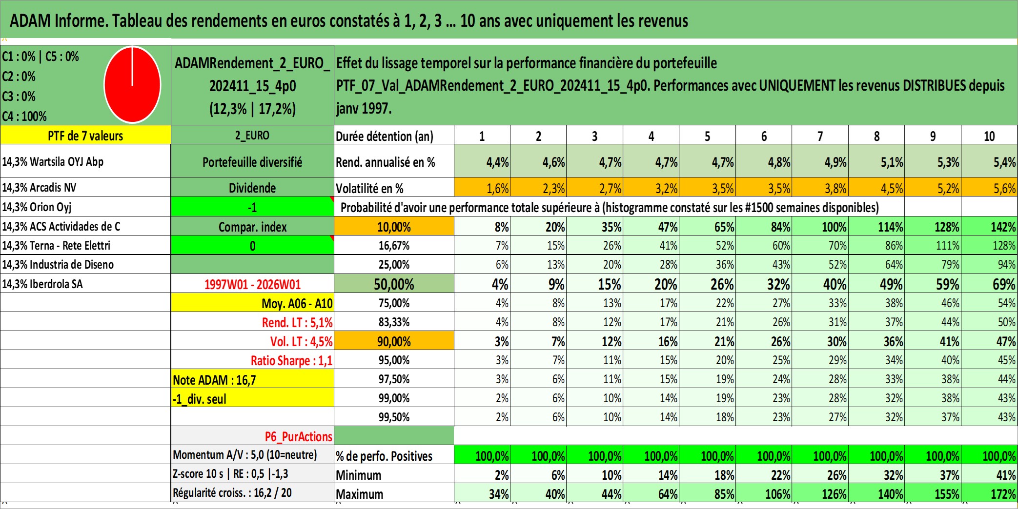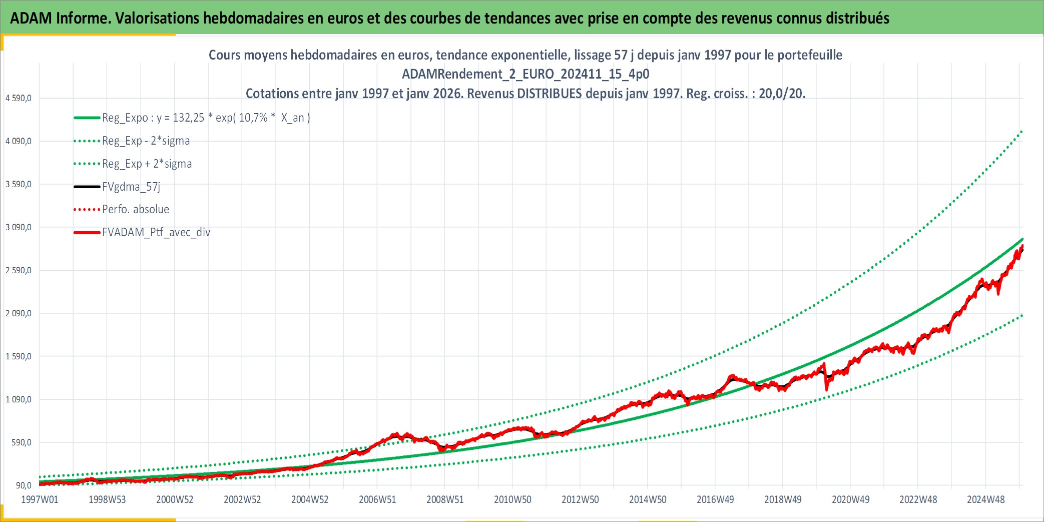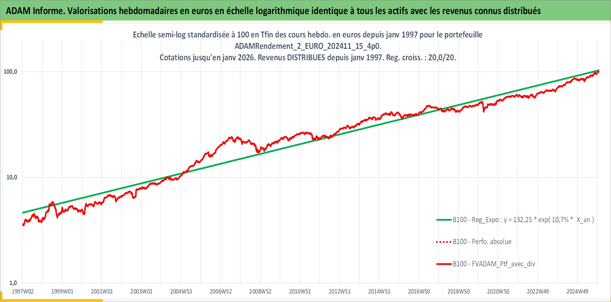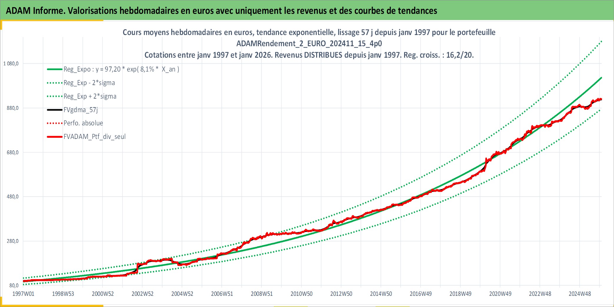Site dédié aux investisseursPage dédiée sur site financeAnalyse des valorisations hebdomadaires du portefeuille ADAMRendement_2_EURO_202411_15_4p0_7actifs avec un profil P6_PurActions. Ce portefeuille est cote en EUR. Les valorisations couvrent les semaines 1997W01 a 2026W01. Les revenus de cet actif financier sont pris en compte depuis la semaine 1997W01. La note globale ESG de cet actif est estimee a 11.2 (apres rebasage entre 0 et 20).