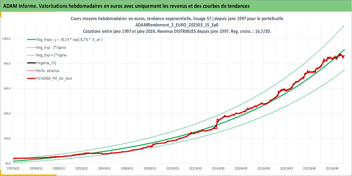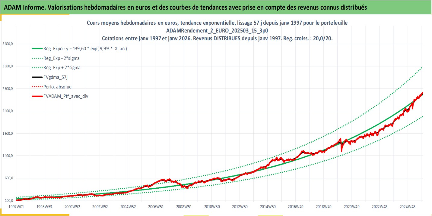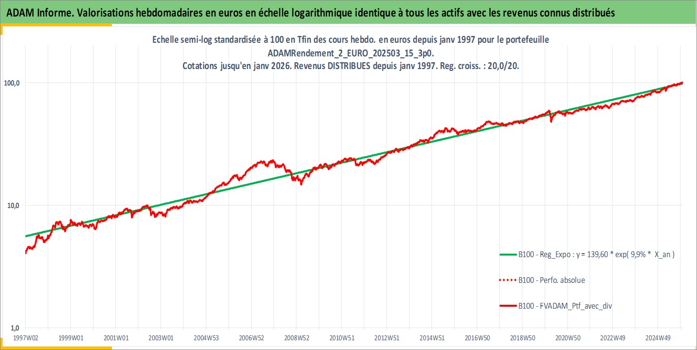 Site dédié aux investisseursPage dédiée sur site financeAnalyse des valorisations hebdomadaires du portefeuille ADAMRendement_2_EURO_202503_15_3p0_11actifs avec un profil P6_PurActions. Ce portefeuille est cote en EUR. Les valorisations couvrent les semaines 1997W01 a 2026W01. Les revenus de cet actif financier sont pris en compte depuis la semaine 1997W01. La note globale ESG de cet actif est estimee a 11.0 (apres rebasage entre 0 et 20).