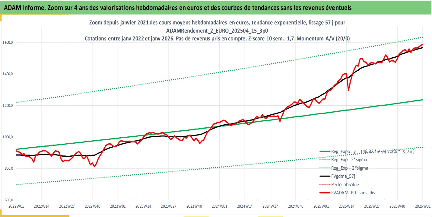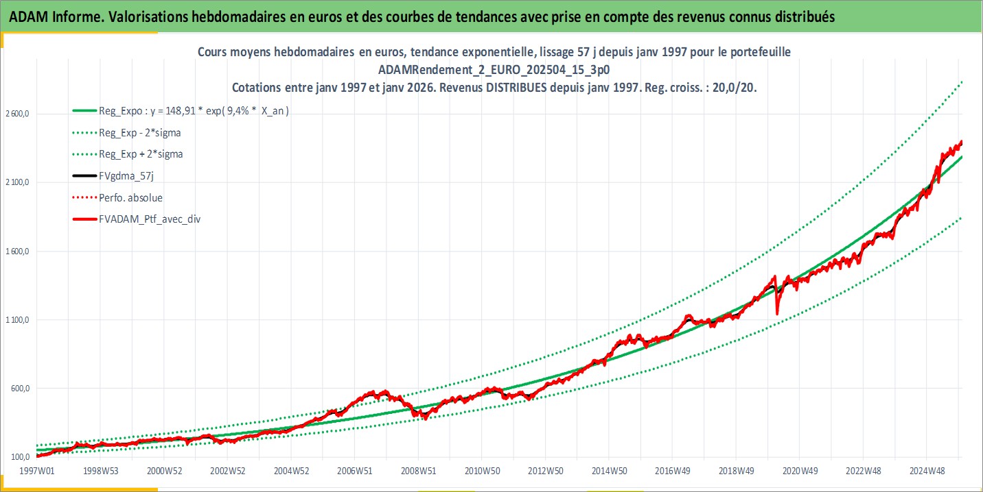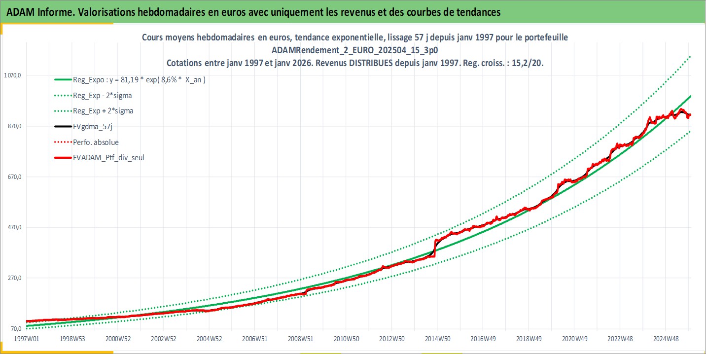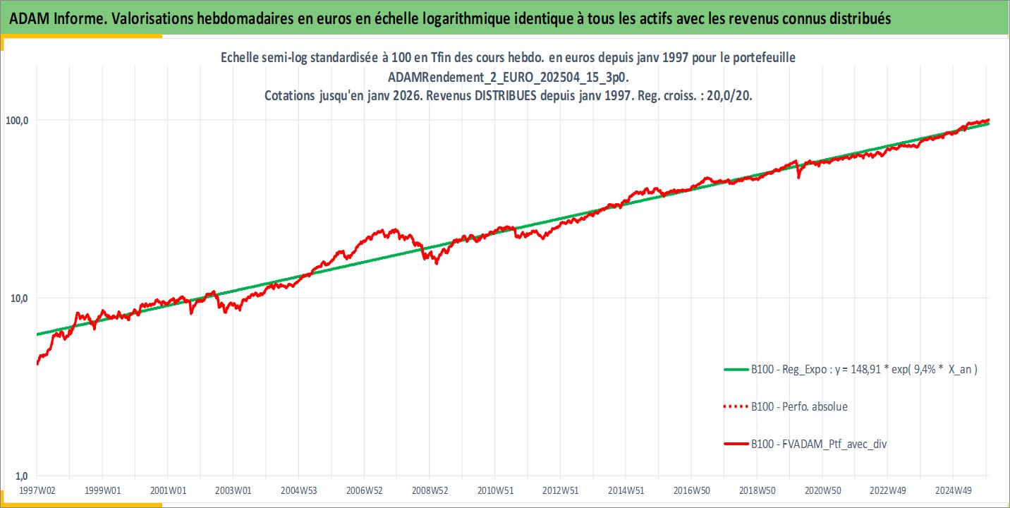 Site dédié aux investisseursPage dédiée sur site financeAnalyse des valorisations hebdomadaires du portefeuille ADAMRendement_2_EURO_202504_15_3p0_11actifs avec un profil P6_PurActions. Ce portefeuille est cote en EUR. Les valorisations couvrent les semaines 1997W01 a 2026W01. Les revenus de cet actif financier sont pris en compte depuis la semaine 1997W01. La note globale ESG de cet actif est estimee a 10.7 (apres rebasage entre 0 et 20).