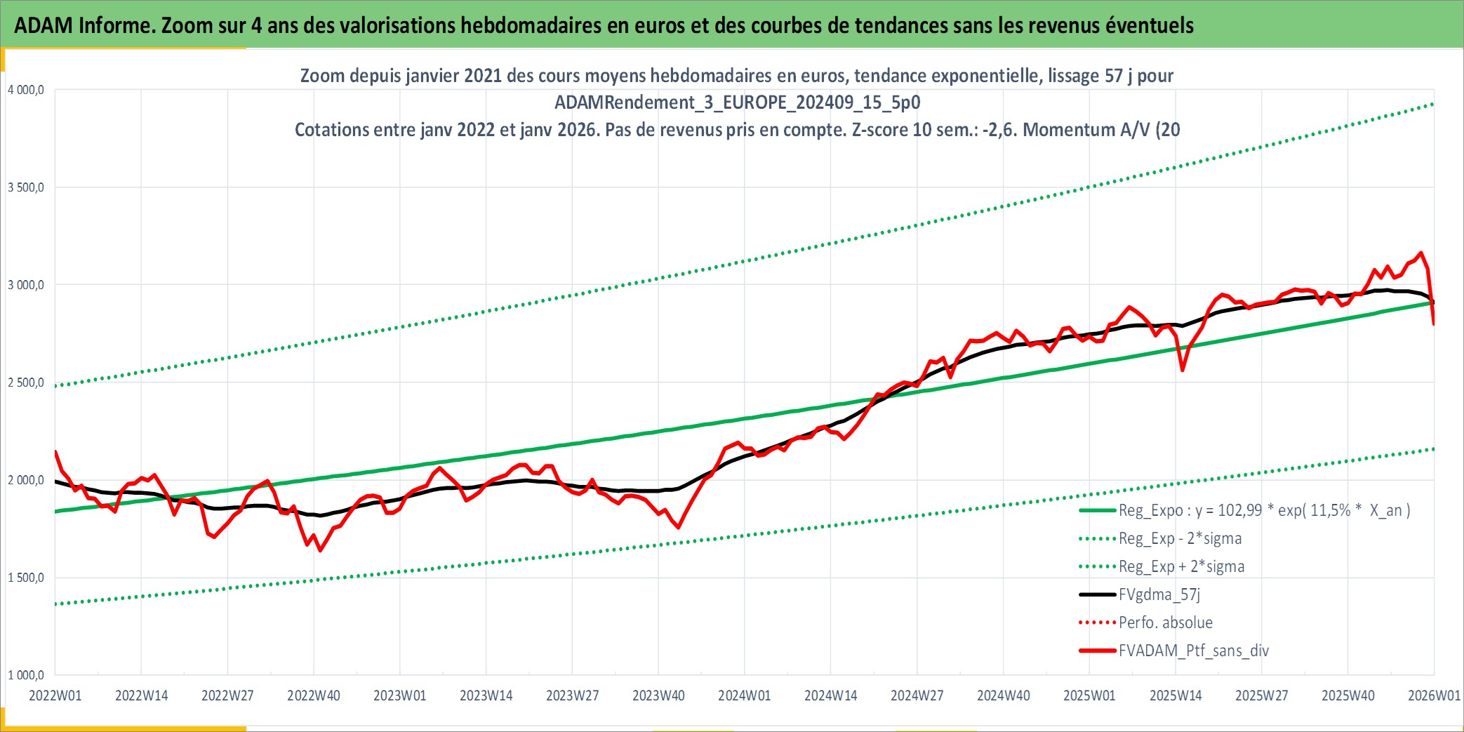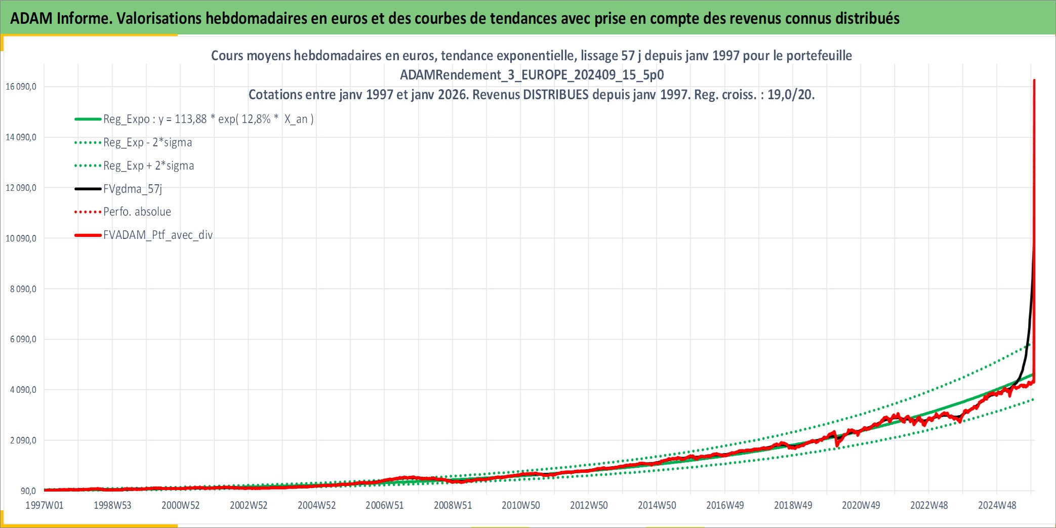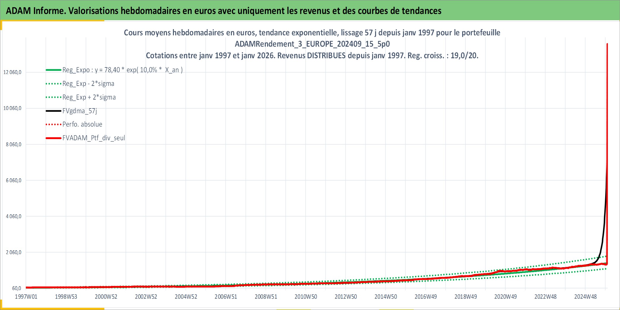 Site dédié aux investisseursPage dédiée sur site financeAnalyse des valorisations hebdomadaires du portefeuille ADAMRendement_3_EUROPE_202409_15_5p0_10actifs avec un profil P6_PurActions. Ce portefeuille est cote en EUR. Les valorisations couvrent les semaines 1997W01 a 2026W01. Les revenus de cet actif financier sont pris en compte depuis la semaine 1997W01. La note globale ESG de cet actif est estimee a 11.3 (apres rebasage entre 0 et 20).