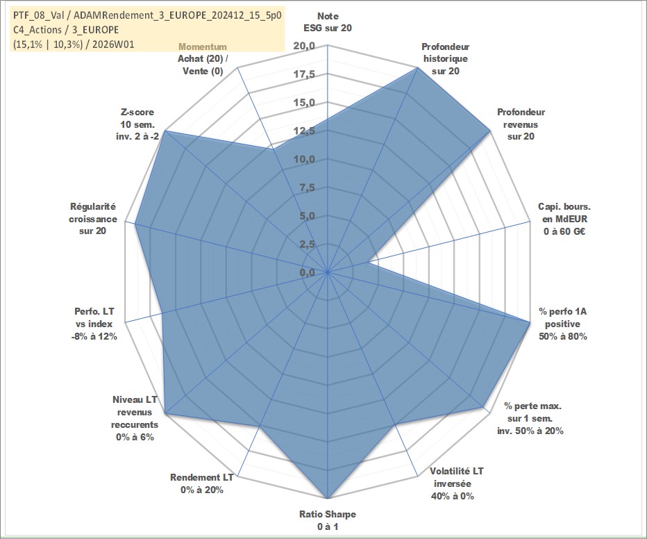 Site dédié aux investisseursPage dédiée sur site financeAnalyse des valorisations hebdomadaires du portefeuille ADAMRendement_3_EUROPE_202412_15_5p0_8actifs avec un profil P6_PurActions. Ce portefeuille est cote en EUR. Les valorisations couvrent les semaines 1997W01 a 2026W01. Les revenus de cet actif financier sont pris en compte depuis la semaine 1997W01. La note globale ESG de cet actif est estimee a 13.5 (apres rebasage entre 0 et 20).