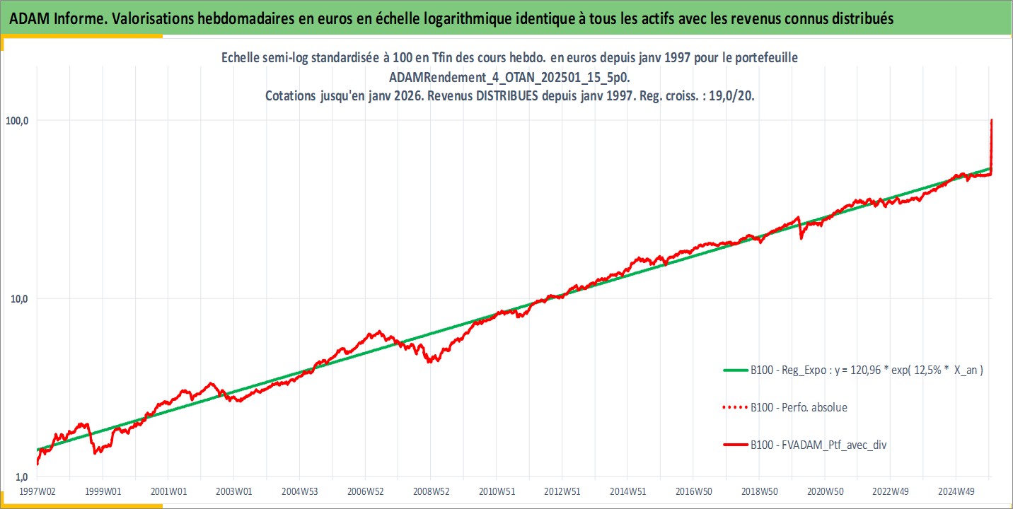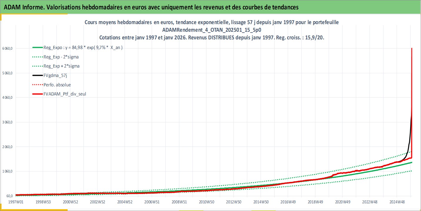Site dédié aux investisseursPage dédiée sur site financeAnalyse des valorisations hebdomadaires du portefeuille ADAMRendement_4_OTAN_202501_15_5p0_26actifs avec un profil P6_PurActions. Ce portefeuille est cote en EUR. Les valorisations couvrent les semaines 1997W01 a 2026W01. Les revenus de cet actif financier sont pris en compte depuis la semaine 1997W01. La note globale ESG de cet actif est estimee a 11.6 (apres rebasage entre 0 et 20).