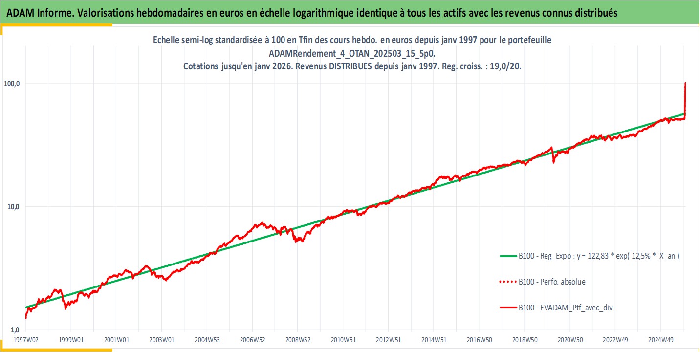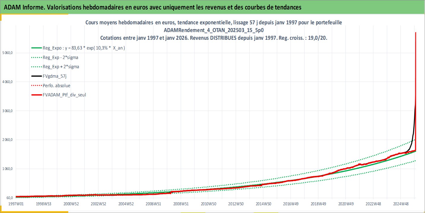 Site dédié aux investisseursPage dédiée sur site financeAnalyse des valorisations hebdomadaires du portefeuille ADAMRendement_4_OTAN_202503_15_5p0_27actifs avec un profil P6_PurActions. Ce portefeuille est cote en EUR. Les valorisations couvrent les semaines 1997W01 a 2026W01. Les revenus de cet actif financier sont pris en compte depuis la semaine 1997W01. La note globale ESG de cet actif est estimee a 11.0 (apres rebasage entre 0 et 20).