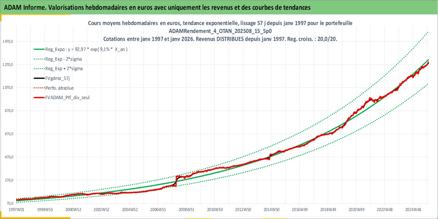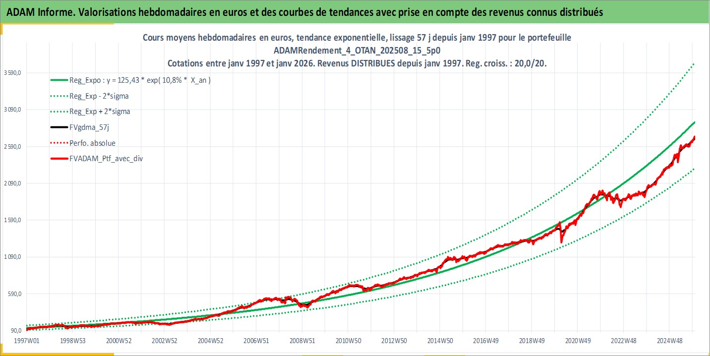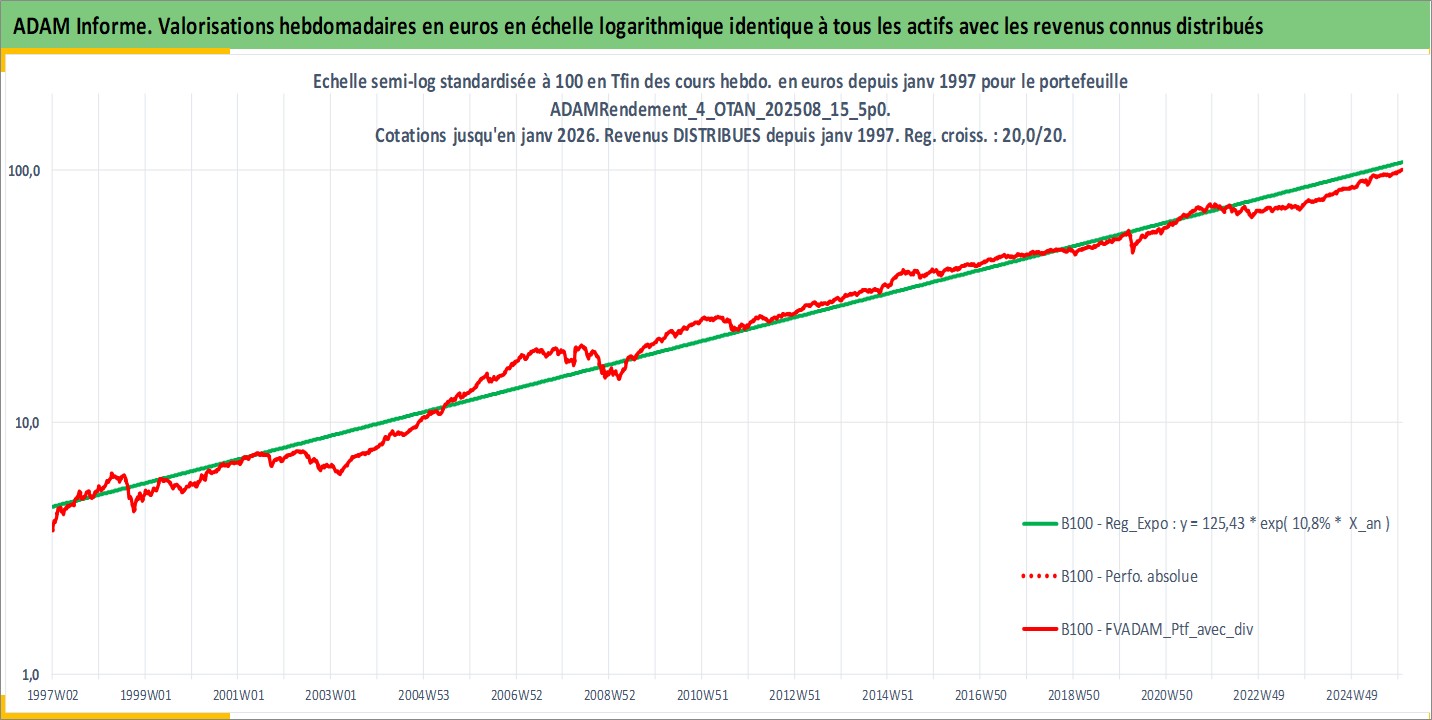 Site dédié aux investisseursPage dédiée sur site financeAnalyse des valorisations hebdomadaires du portefeuille ADAMRendement_4_OTAN_202508_15_5p0_17actifs avec un profil P6_PurActions. Ce portefeuille est cote en EUR. Les valorisations couvrent les semaines 1997W01 a 2026W01. Les revenus de cet actif financier sont pris en compte depuis la semaine 1997W01. La note globale ESG de cet actif est estimee a 12.4 (apres rebasage entre 0 et 20).