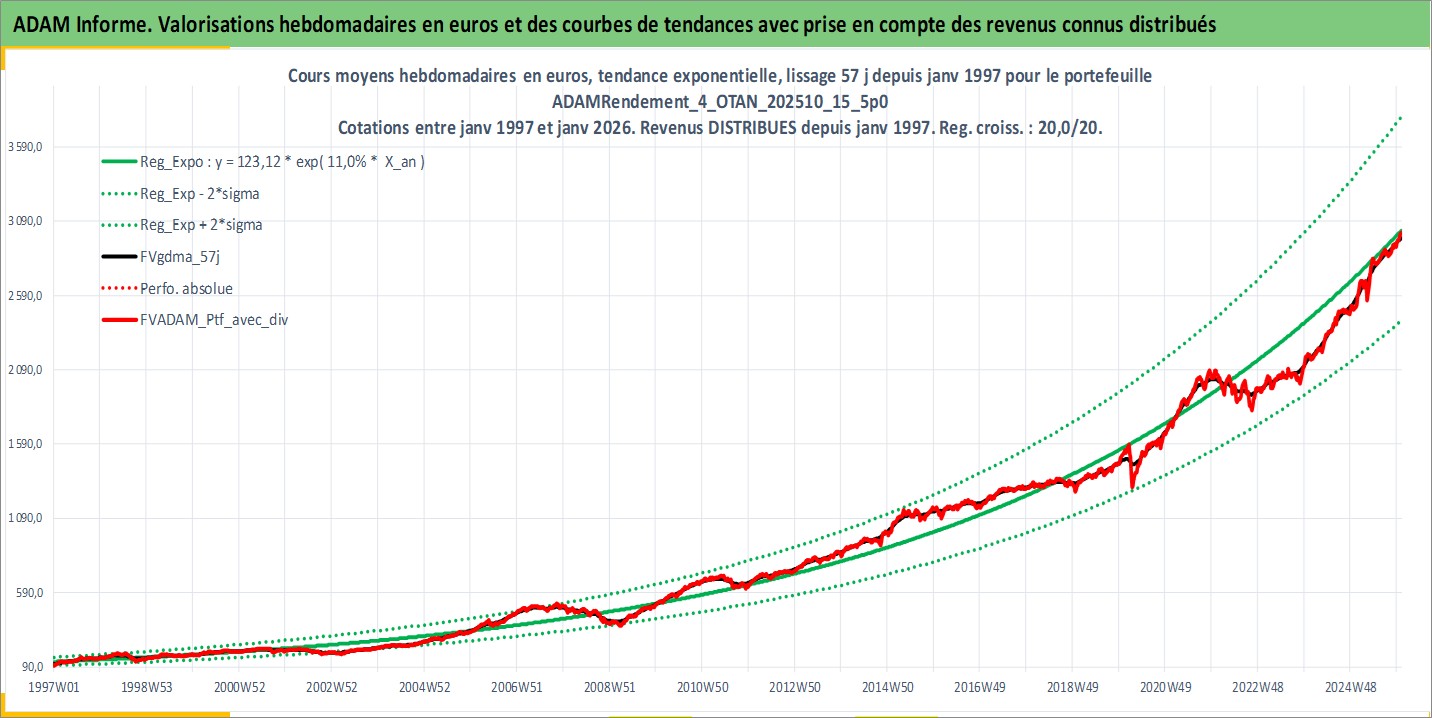 Site dédié aux investisseursPage dédiée sur site financeAnalyse des valorisations hebdomadaires du portefeuille ADAMRendement_4_OTAN_202510_15_5p0_13actifs avec un profil P6_PurActions. Ce portefeuille est cote en EUR. Les valorisations couvrent les semaines 1997W01 a 2026W01. Les revenus de cet actif financier sont pris en compte depuis la semaine 1997W01. La note globale ESG de cet actif est estimee a 12.6 (apres rebasage entre 0 et 20).
