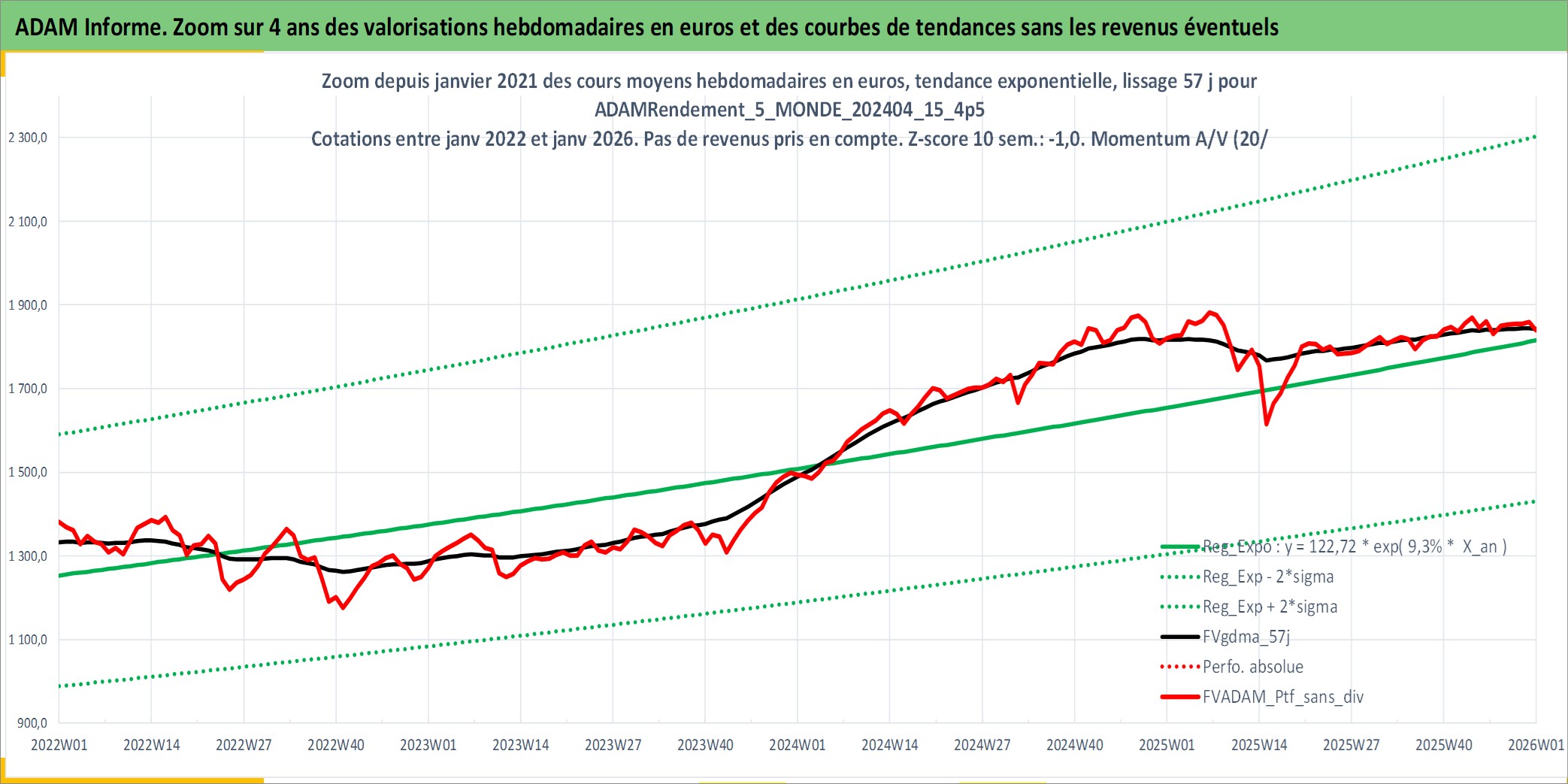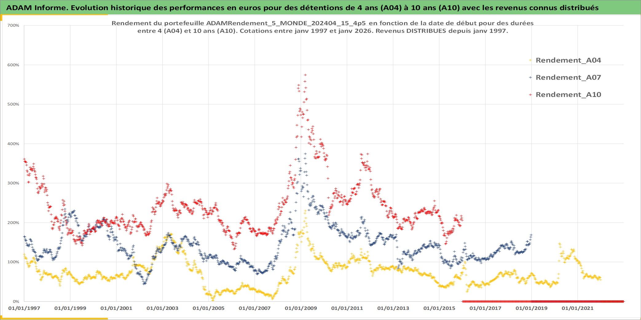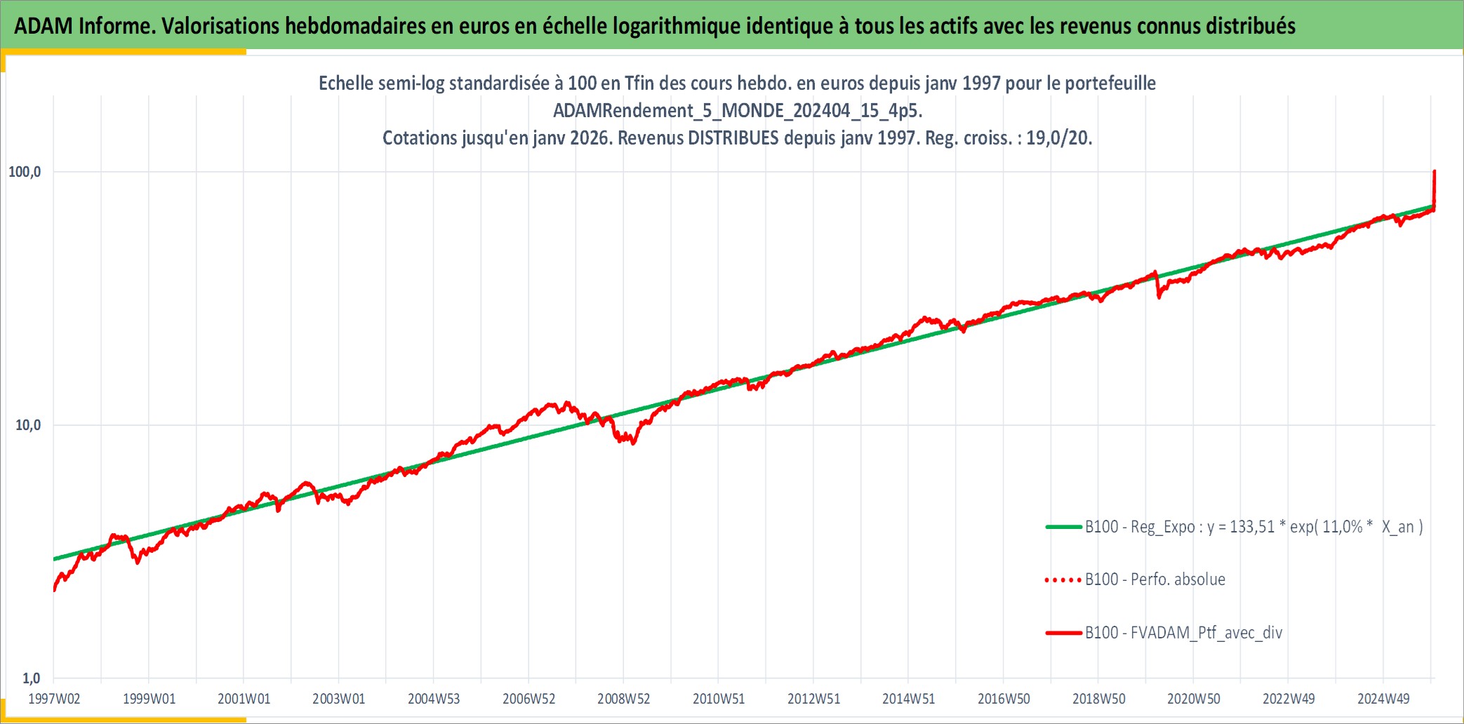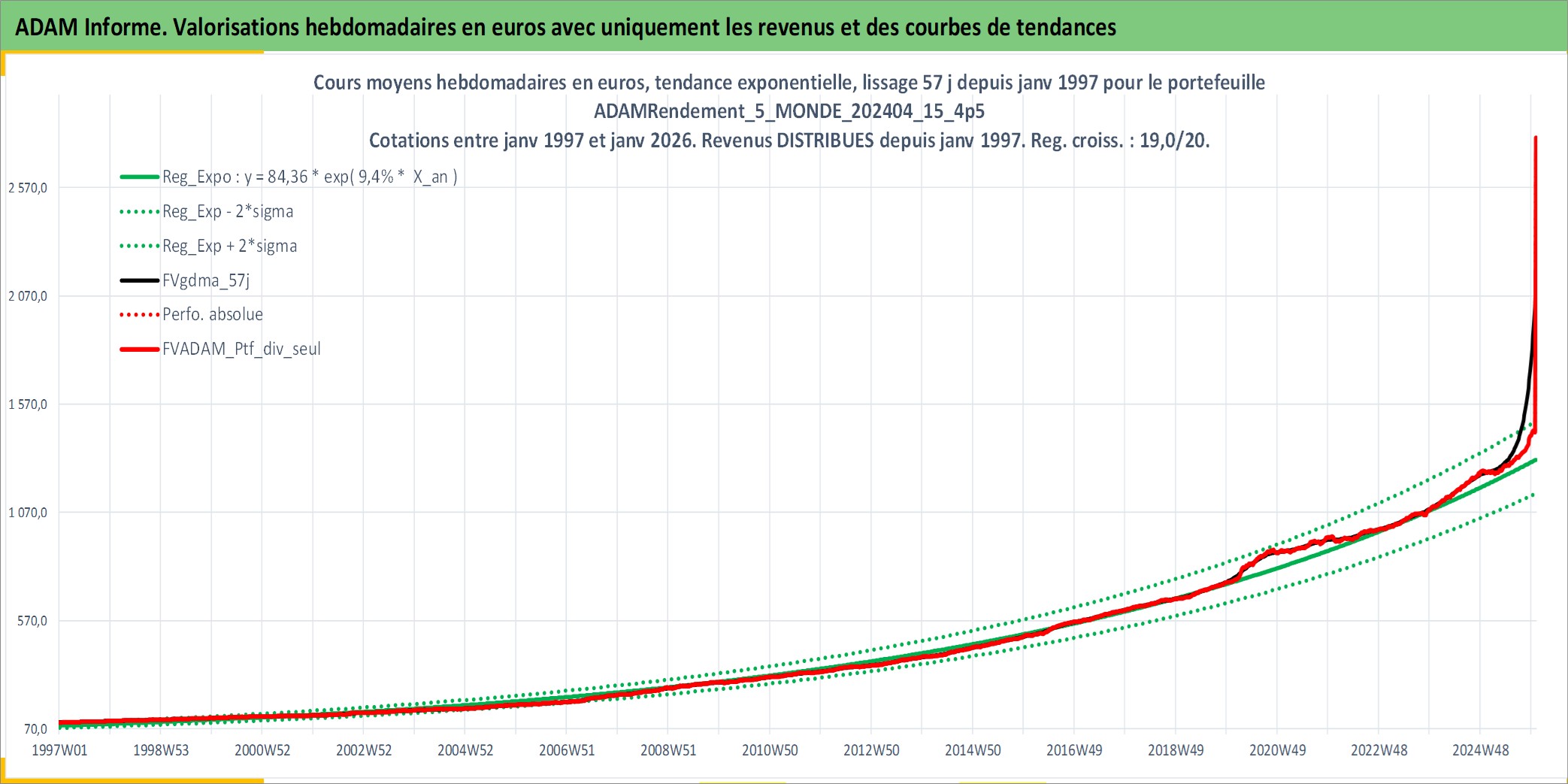 Site dédié aux investisseursPage dédiée sur site financeAnalyse des valorisations hebdomadaires du portefeuille ADAMRendement_5_MONDE_202404_15_4p5_59actifs avec un profil P6_PurActions. Ce portefeuille est cote en EUR. Les valorisations couvrent les semaines 1997W01 a 2026W01. Les revenus de cet actif financier sont pris en compte depuis la semaine 1997W01. La note globale ESG de cet actif est estimee a 9.6 (apres rebasage entre 0 et 20).