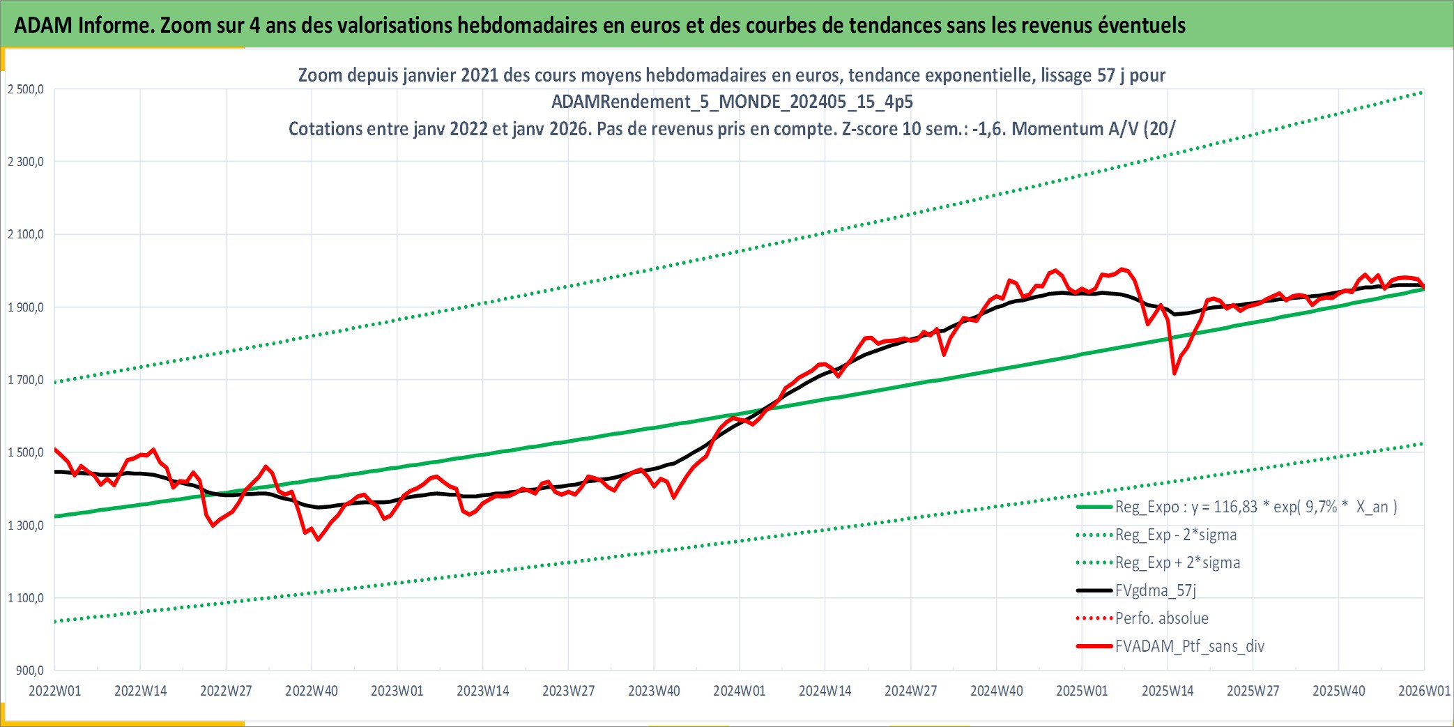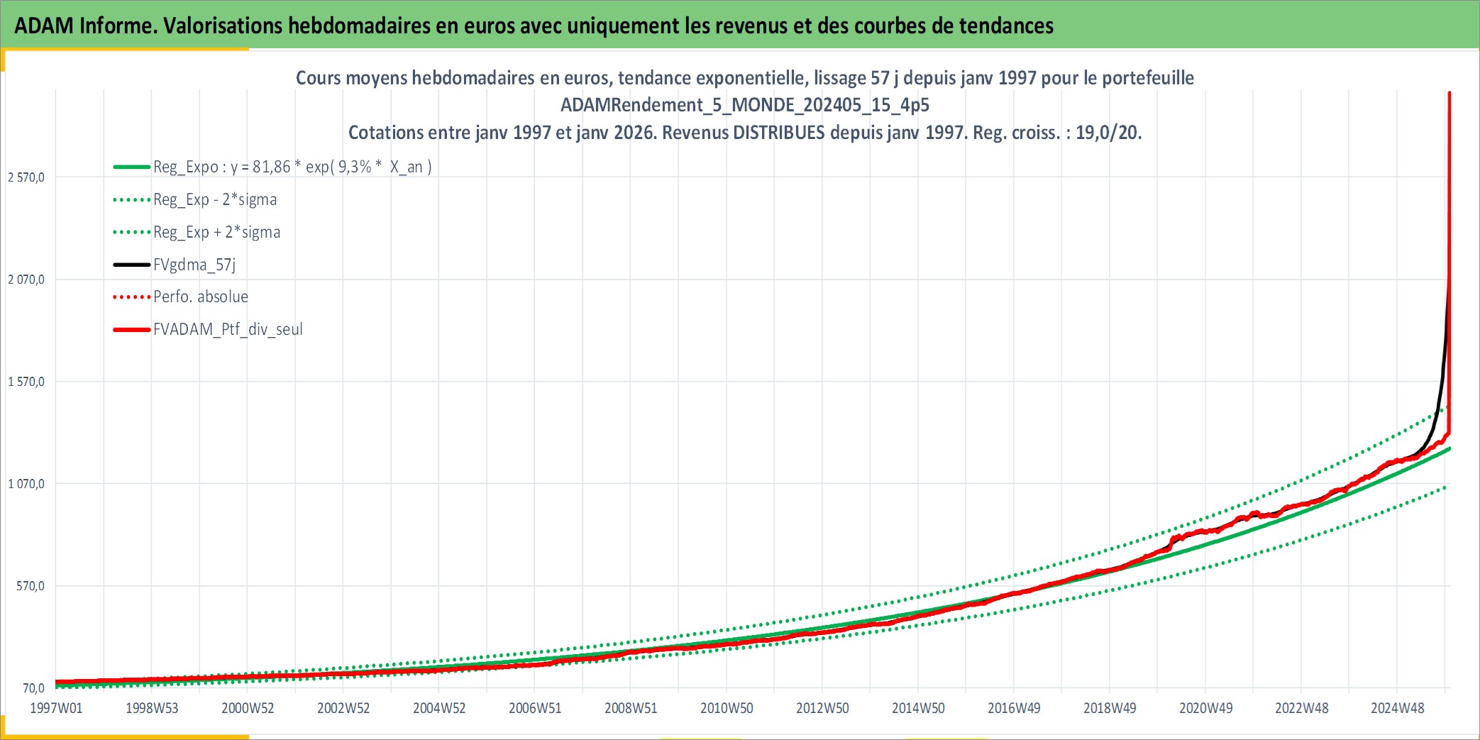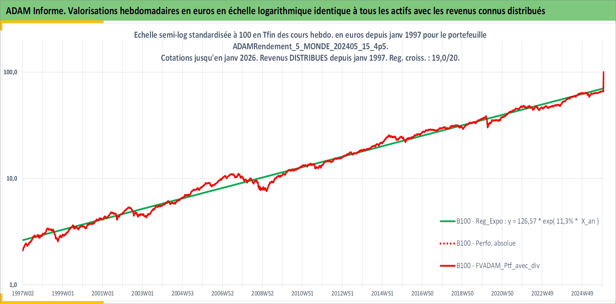 Site dédié aux investisseursPage dédiée sur site financeAnalyse des valorisations hebdomadaires du portefeuille ADAMRendement_5_MONDE_202405_15_4p5_51actifs avec un profil P6_PurActions. Ce portefeuille est cote en EUR. Les valorisations couvrent les semaines 1997W01 a 2026W01. Les revenus de cet actif financier sont pris en compte depuis la semaine 1997W01. La note globale ESG de cet actif est estimee a 9.4 (apres rebasage entre 0 et 20).