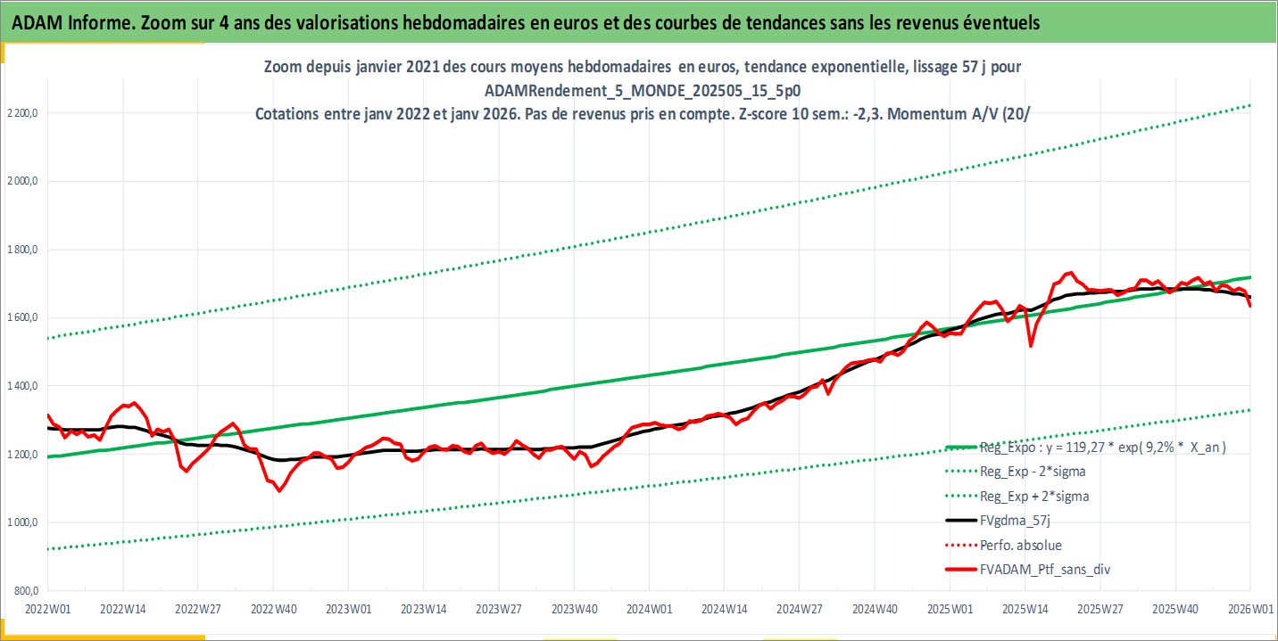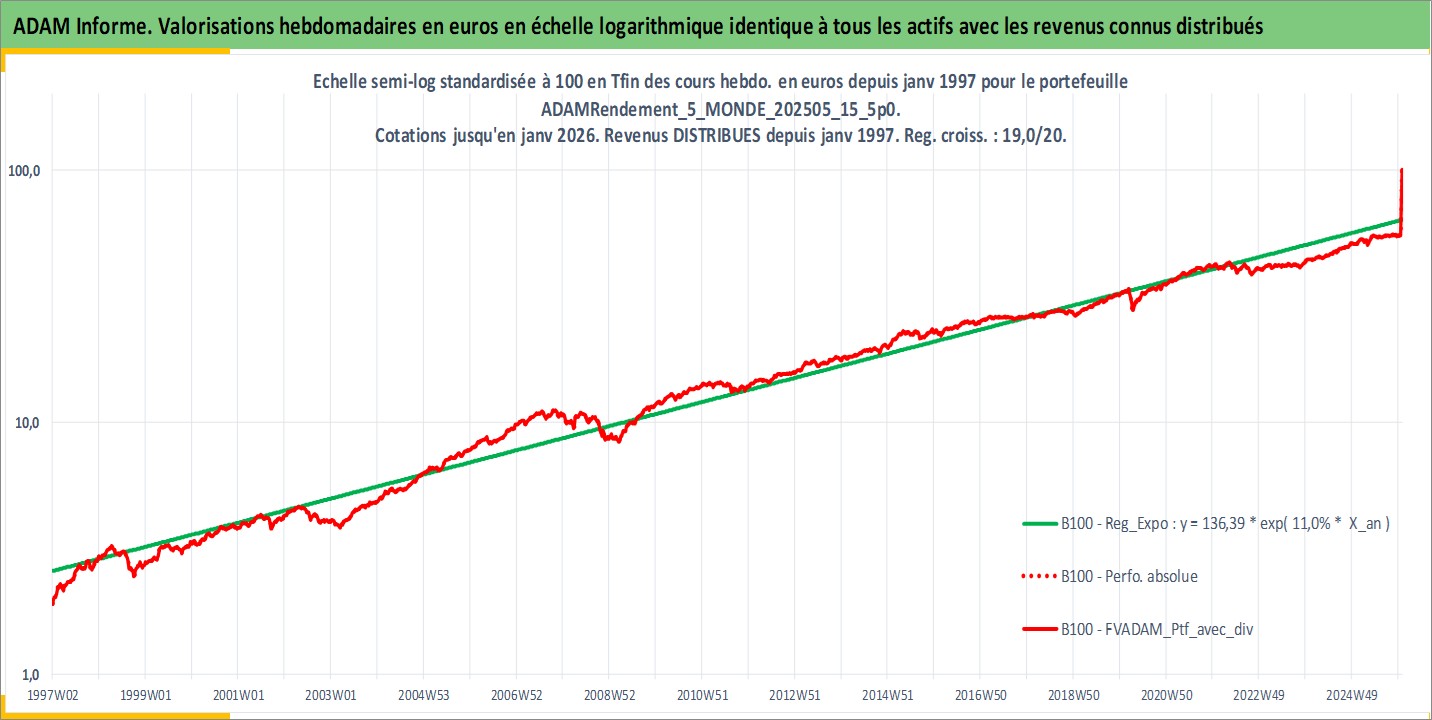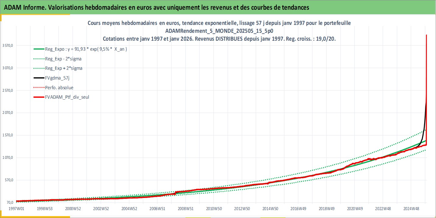 Site dédié aux investisseursPage dédiée sur site financeAnalyse des valorisations hebdomadaires du portefeuille ADAMRendement_5_MONDE_202505_15_5p0_29actifs avec un profil P6_PurActions. Ce portefeuille est cote en EUR. Les valorisations couvrent les semaines 1997W01 a 2026W01. Les revenus de cet actif financier sont pris en compte depuis la semaine 1997W01. La note globale ESG de cet actif est estimee a 12.0 (apres rebasage entre 0 et 20).