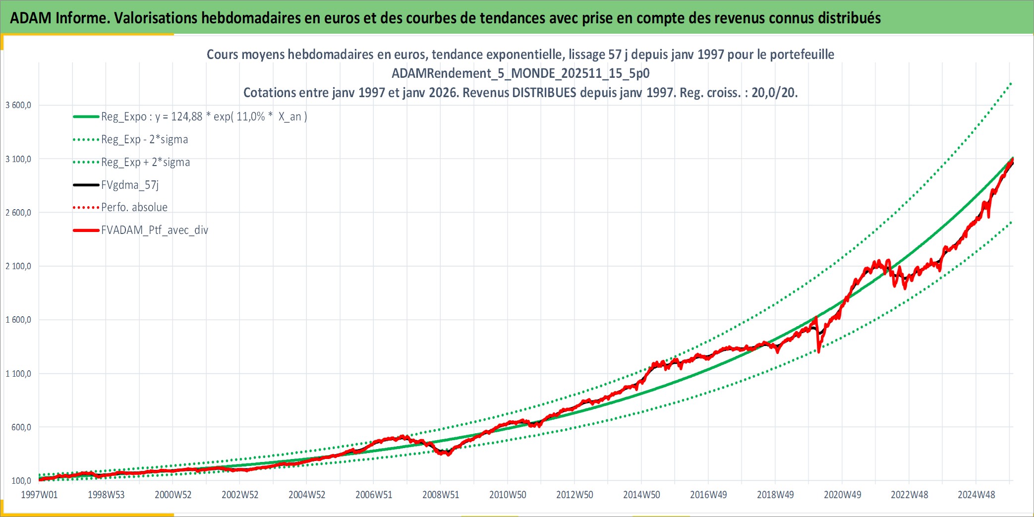 Site dédié aux investisseursPage dédiée sur site financeAnalyse des valorisations hebdomadaires du portefeuille ADAMRendement_5_MONDE_202511_15_5p0_18actifs avec un profil P6_PurActions. Ce portefeuille est cote en EUR. Les valorisations couvrent les semaines 1997W01 a 2026W01. Les revenus de cet actif financier sont pris en compte depuis la semaine 1997W01. La note globale ESG de cet actif est estimee a 11.9 (apres rebasage entre 0 et 20).