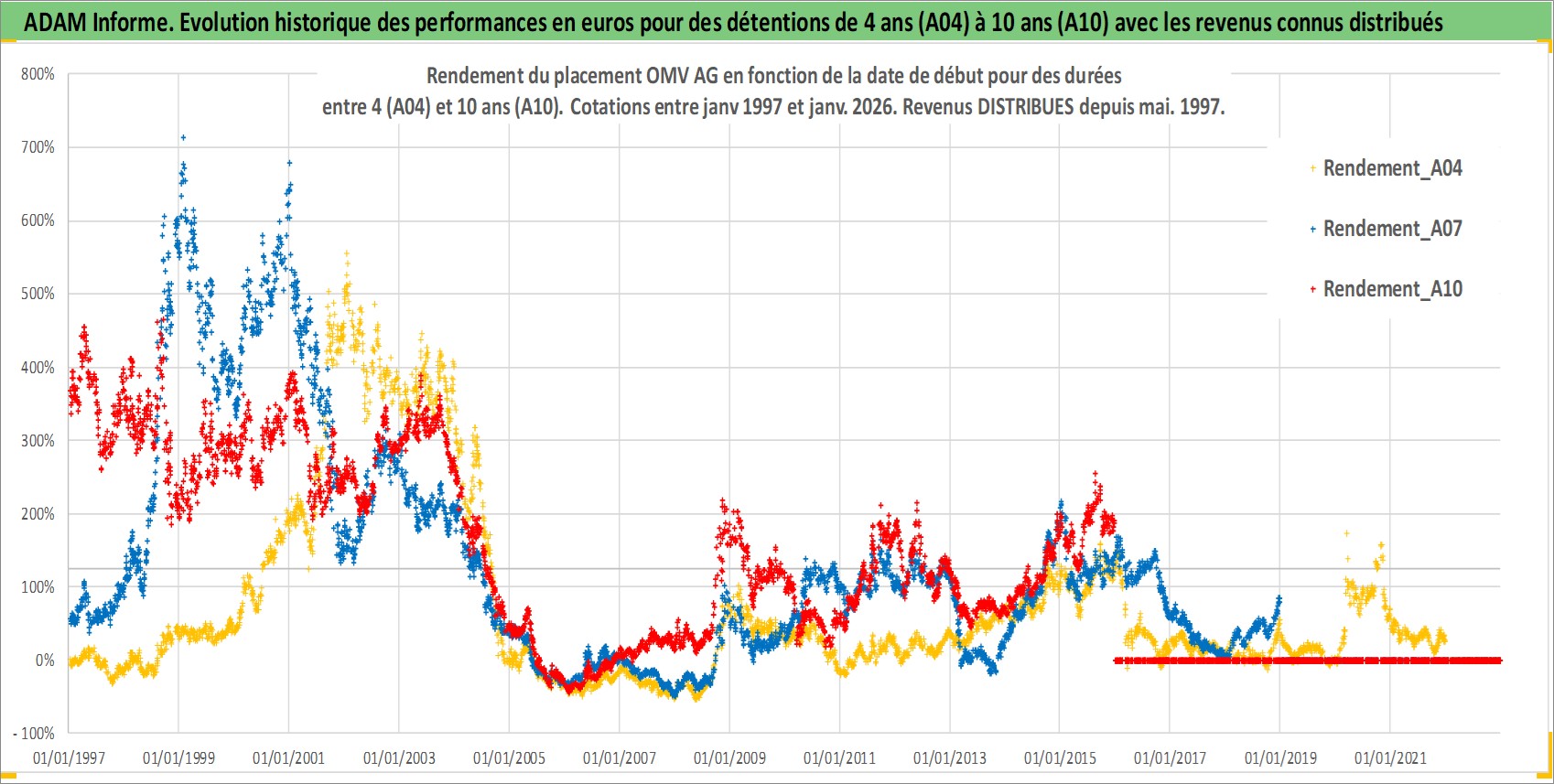 Site dédié aux investisseursPage dédiée sur site financeAnalyse des valorisations hebdomadaires de l'action OMV AG. Cet actif est cote en EUR. Les valorisations couvrent les semaines 1997W01 a 2026W01. Les revenus de cet actif financier sont pris en compte depuis la semaine 1997W19. La note globale ESG de cet actif est estimee a 7.0 (apres rebasage entre 0 et 20).