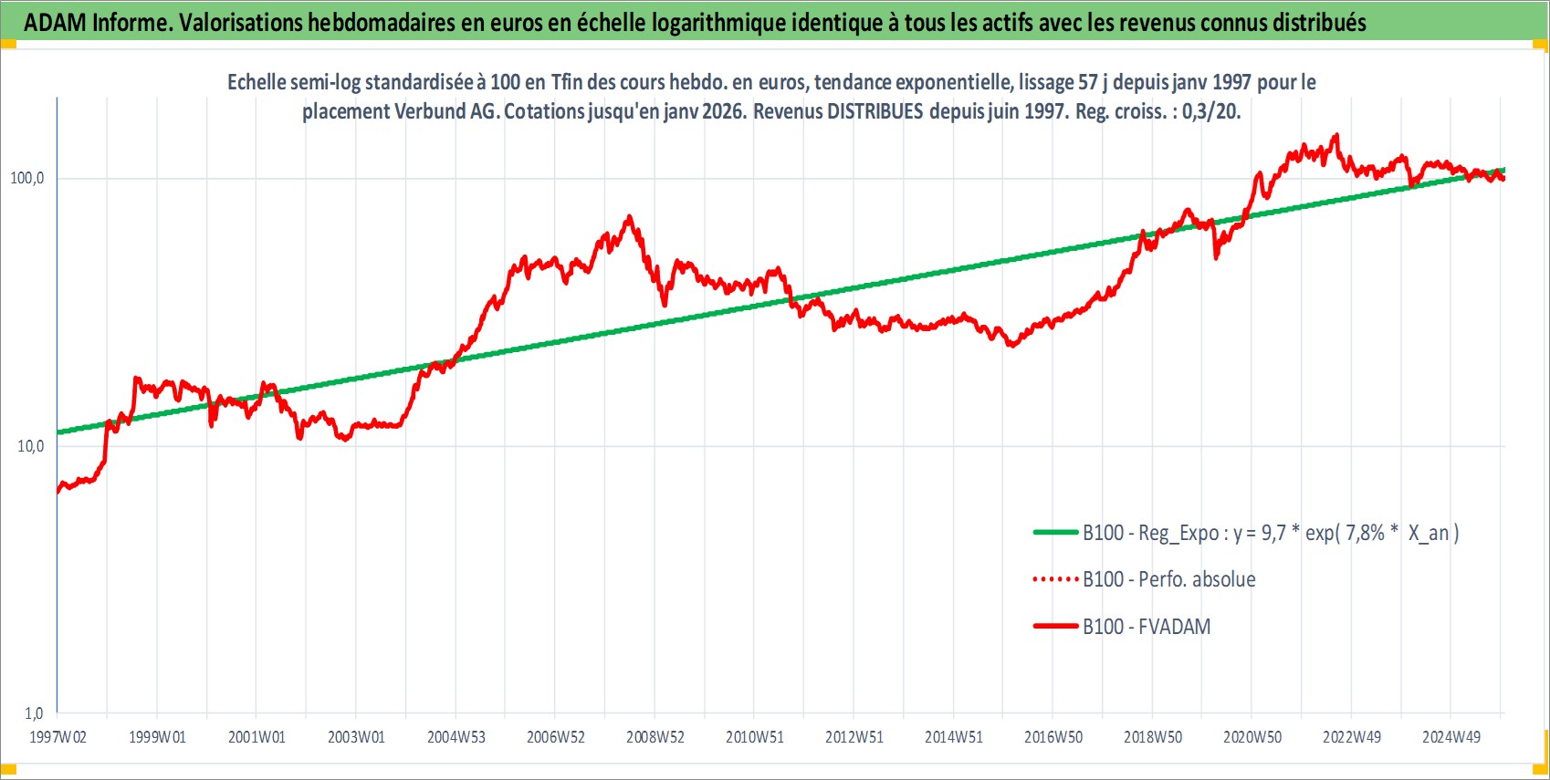 Site dédié aux investisseursPage dédiée sur site financeAnalyse des valorisations hebdomadaires de l'action Verbund AG. Cet actif est cote en EUR. Les valorisations couvrent les semaines 1997W01 a 2026W01. Les revenus de cet actif financier sont pris en compte depuis la semaine 1997W24. La note globale ESG de cet actif est estimee a 11.0 (apres rebasage entre 0 et 20).
