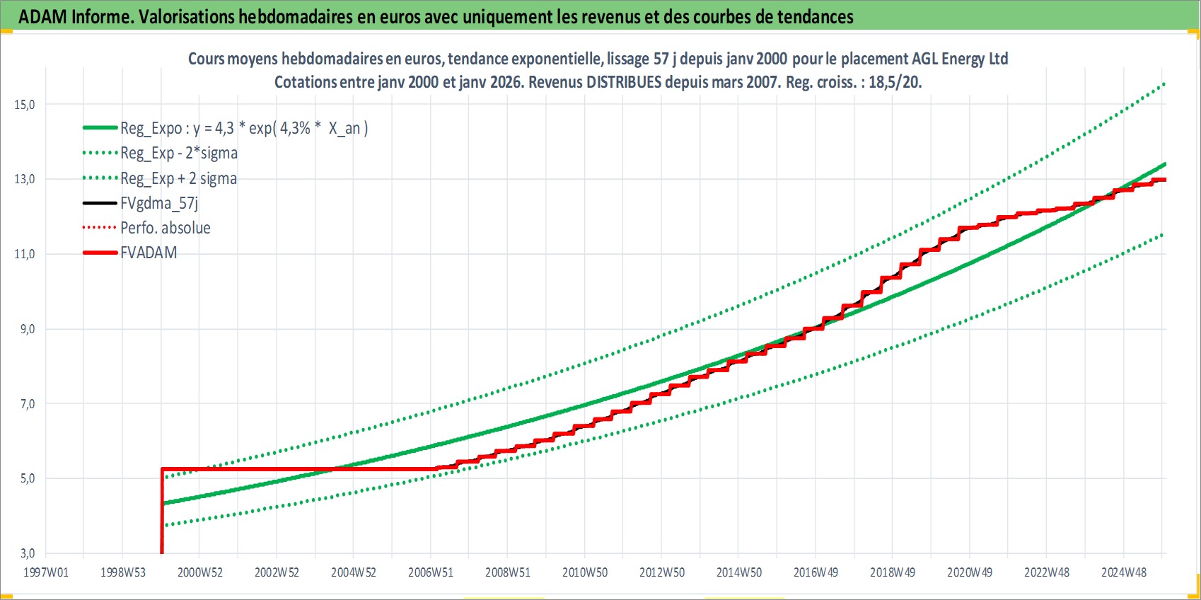 Site dédié aux investisseursPage dédiée sur site financeAnalyse des valorisations hebdomadaires de l'action AGL Energy Ltd. Cet actif est cote en AUD. Les valorisations sont en contrevaleur EURO et couvrent les semaines 2000W01 a 2026W01. Les revenus de cet actif financier sont pris en compte depuis la semaine 2007W09. La note globale ESG de cet actif est estimee a 4.0 (apres rebasage entre 0 et 20).