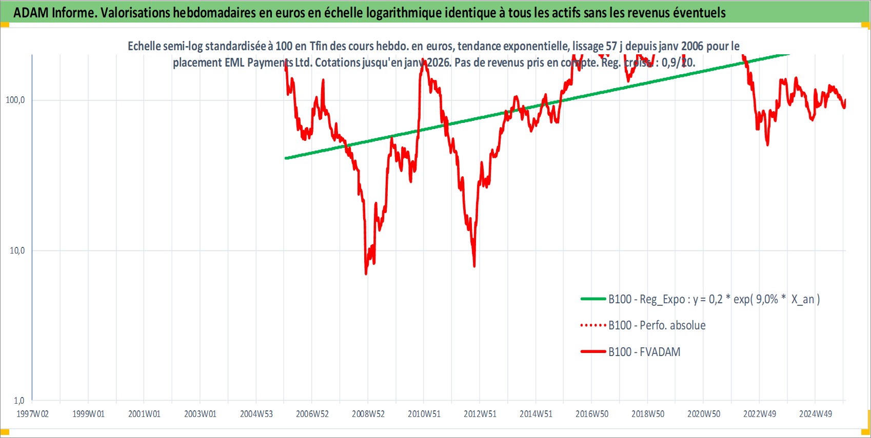 Site dédié aux investisseursPage dédiée sur site financeAnalyse des valorisations hebdomadaires de l'action EML Payments Ltd. Cet actif est cote en AUD. Les valorisations sont en contrevaleur EURO et couvrent les semaines 2006W03 a 2026W01. Les revenus de cet actif financier ne sont pas connus car non existants ou non disponibles sur le site Yahoo Finance. La note ESG de cet actif n'est pas connue.