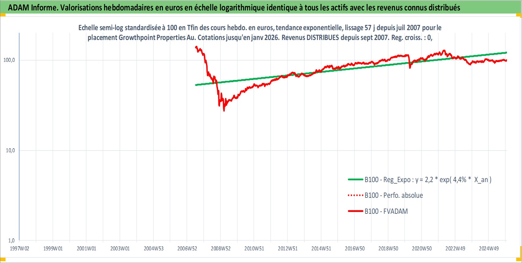 Site dédié aux investisseursPage dédiée sur site financeAnalyse des valorisations hebdomadaires de l'action Growthpoint Properties Australia. Cet actif est cote en AUD. Les valorisations sont en contrevaleur EURO et couvrent les semaines 2007W27 a 2026W01. Les revenus de cet actif financier sont pris en compte depuis la semaine 2007W39. La note ESG de cet actif n'est pas connue.