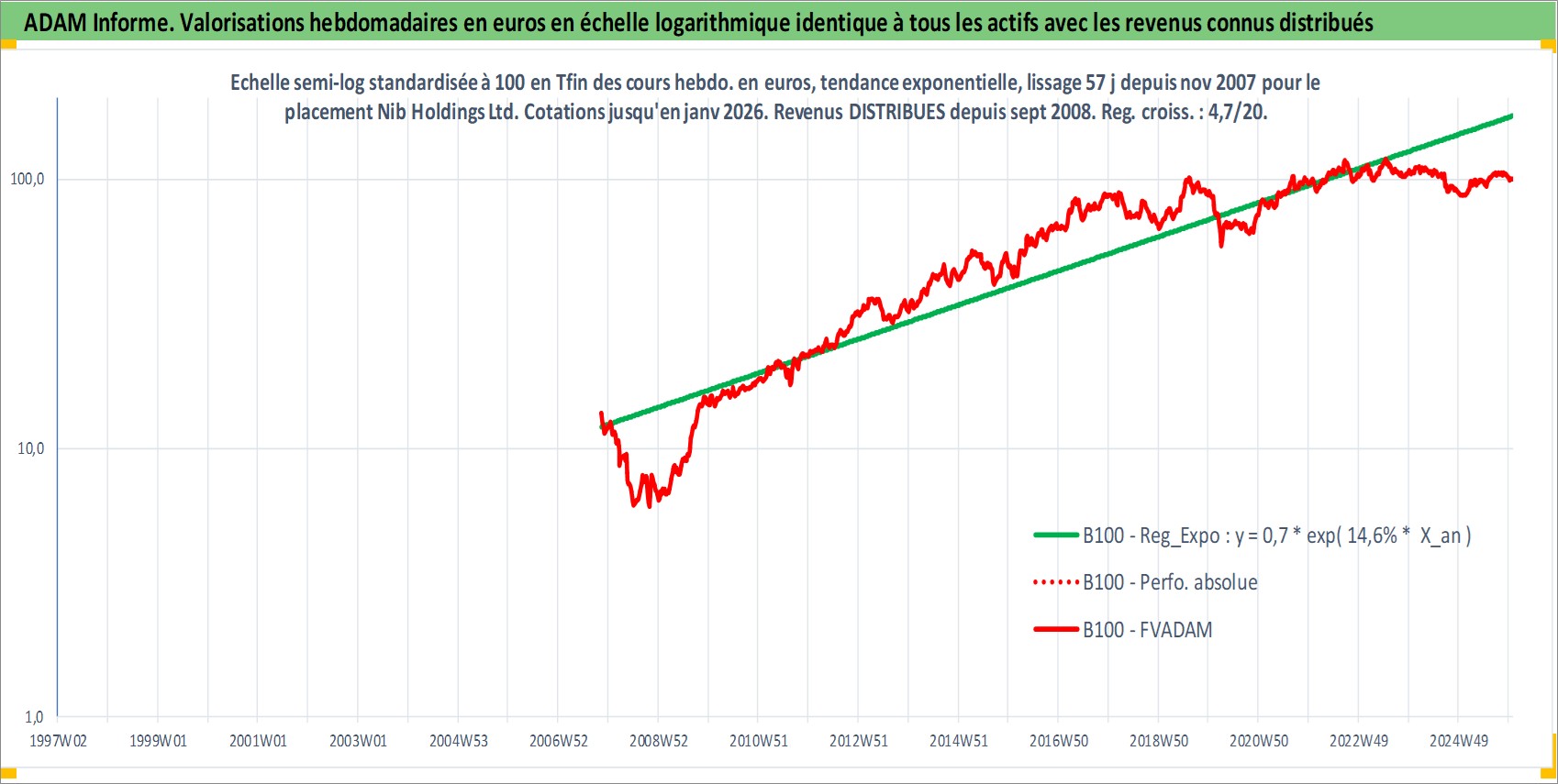 Site dédié aux investisseursPage dédiée sur site financeAnalyse des valorisations hebdomadaires de l'action Nib Holdings Ltd. Cet actif est cote en AUD. Les valorisations sont en contrevaleur EURO et couvrent les semaines 2007W45 a 2026W01. Les revenus de cet actif financier sont pris en compte depuis la semaine 2008W38. La note ESG de cet actif n'est pas connue.