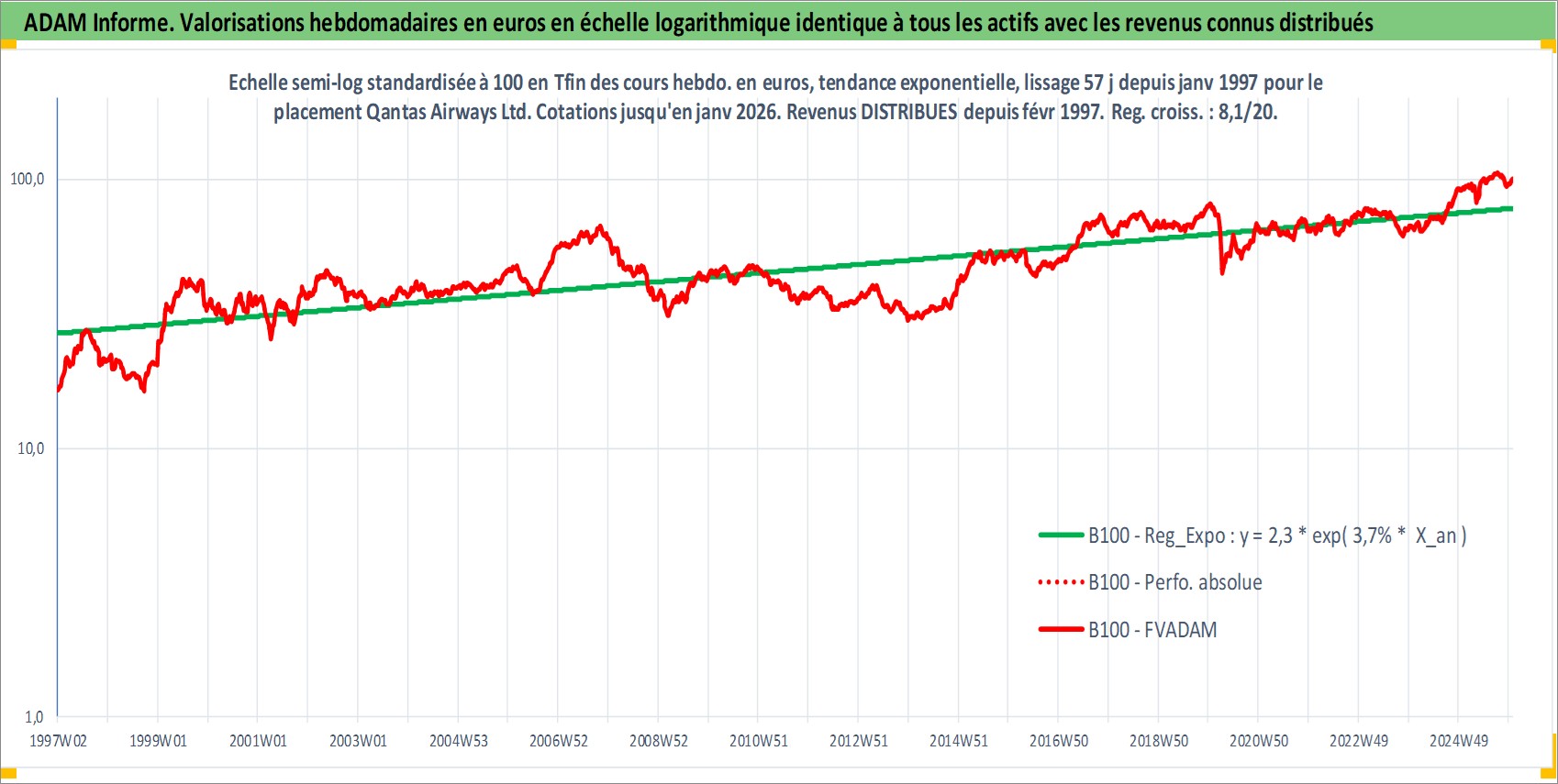 Site dédié aux investisseursPage dédiée sur site financeAnalyse des valorisations hebdomadaires de l'action Qantas Airways Ltd. Cet actif est cote en AUD. Les valorisations sont en contrevaleur EURO et couvrent les semaines 1997W01 a 2026W01. Les revenus de cet actif financier sont pris en compte depuis la semaine 1997W09. La note ESG de cet actif n'est pas connue.