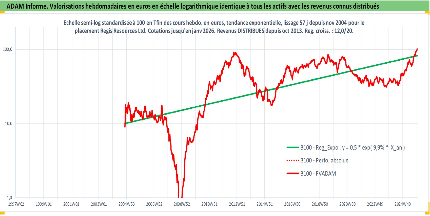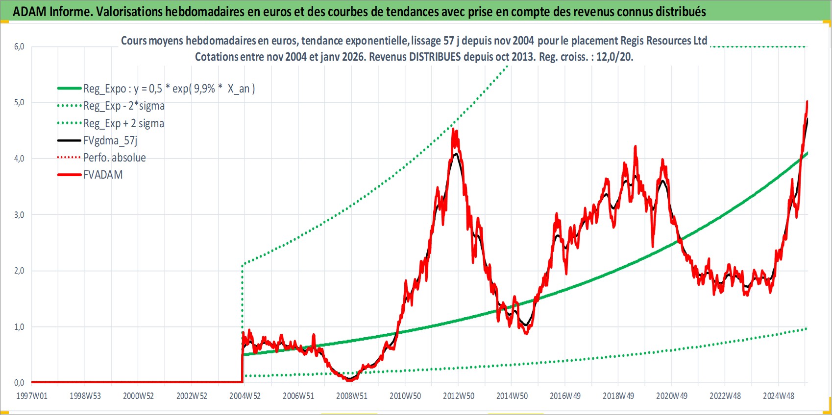 Site dédié aux investisseursPage dédiée sur site financeAnalyse des valorisations hebdomadaires de l'action Regis Resources Ltd. Cet actif est cote en AUD. Les valorisations sont en contrevaleur EURO et couvrent les semaines 2004W47 a 2026W01. Les revenus de cet actif financier sont pris en compte depuis la semaine 2013W41. La note ESG de cet actif n'est pas connue.