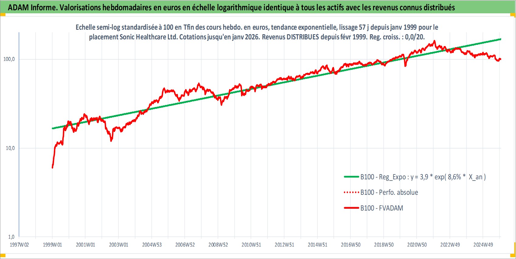 Site dédié aux investisseursPage dédiée sur site financeAnalyse des valorisations hebdomadaires de l'action Sonic Healthcare Ltd. Cet actif est cote en AUD. Les valorisations sont en contrevaleur EURO et couvrent les semaines 1999W01 a 2026W01. Les revenus de cet actif financier sont pris en compte depuis la semaine 1999W08. La note globale ESG de cet actif est estimee a 11.0 (apres rebasage entre 0 et 20).