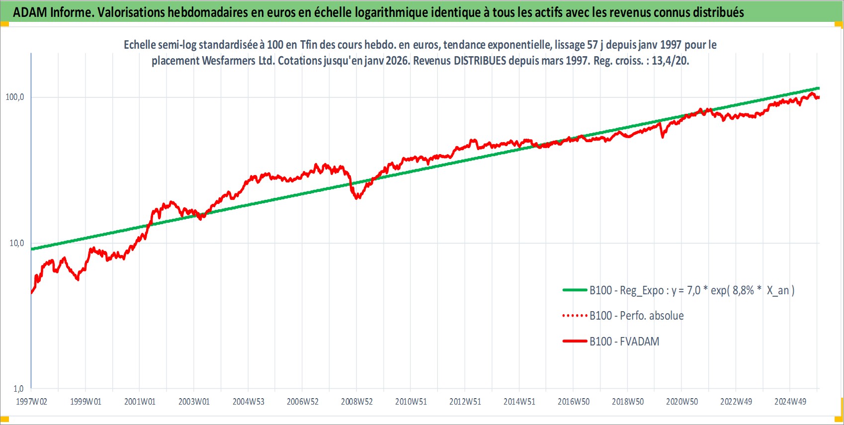 Site dédié aux investisseursPage dédiée sur site financeAnalyse des valorisations hebdomadaires de l'action Wesfarmers Ltd. Cet actif est cote en AUD. Les valorisations sont en contrevaleur EURO et couvrent les semaines 1997W01 a 2026W01. Les revenus de cet actif financier sont pris en compte depuis la semaine 1997W12. La note globale ESG de cet actif est estimee a 15.0 (apres rebasage entre 0 et 20).