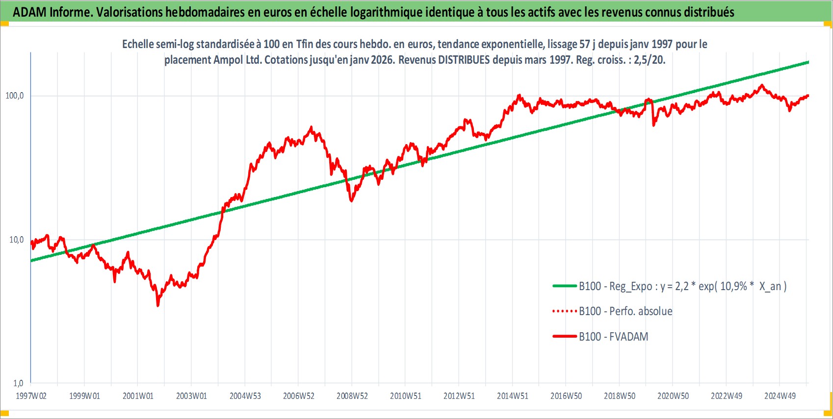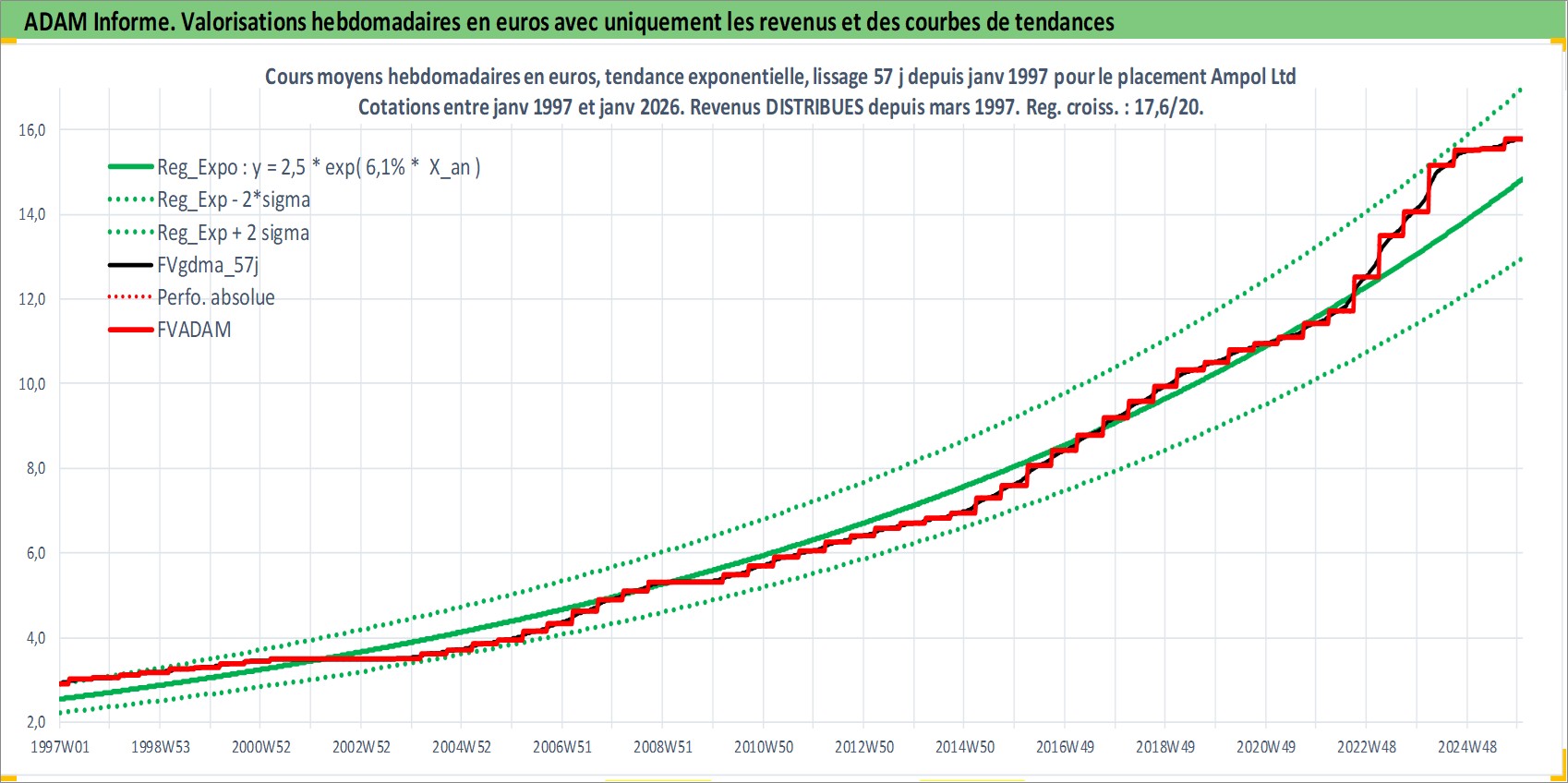 Site dédié aux investisseursPage dédiée sur site financeAnalyse des valorisations hebdomadaires de l'action Ampol Ltd. Cet actif est cote en AUD. Les valorisations sont en contrevaleur EURO et couvrent les semaines 1997W01 a 2026W01. Les revenus de cet actif financier sont pris en compte depuis la semaine 1997W11. La note globale ESG de cet actif est estimee a 4.0 (apres rebasage entre 0 et 20).