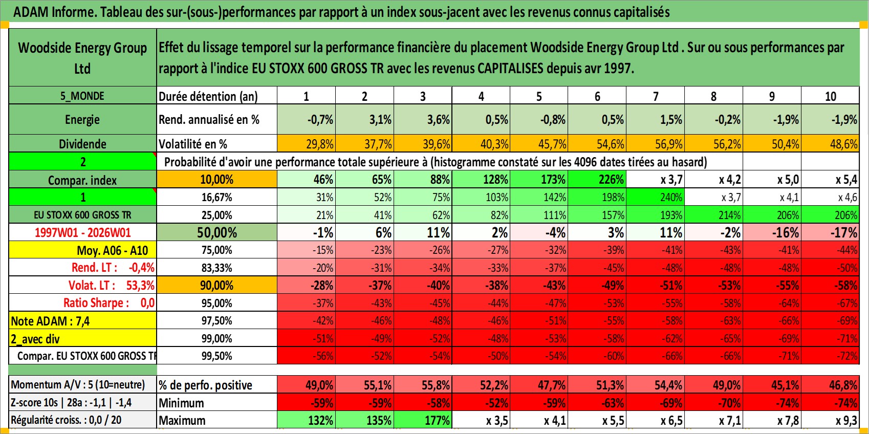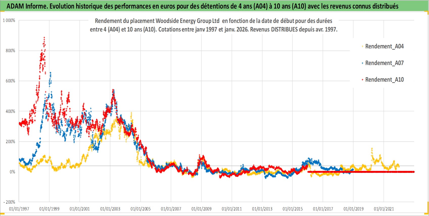 Site dédié aux investisseursPage dédiée sur site financeAnalyse des valorisations hebdomadaires de l'action Woodside Energy Group Ltd . Cet actif est cote en AUD. Les valorisations sont en contrevaleur EURO et couvrent les semaines 1997W01 a 2026W01. Les revenus de cet actif financier sont pris en compte depuis la semaine 1997W15. La note globale ESG de cet actif est estimee a 4.0 (apres rebasage entre 0 et 20).