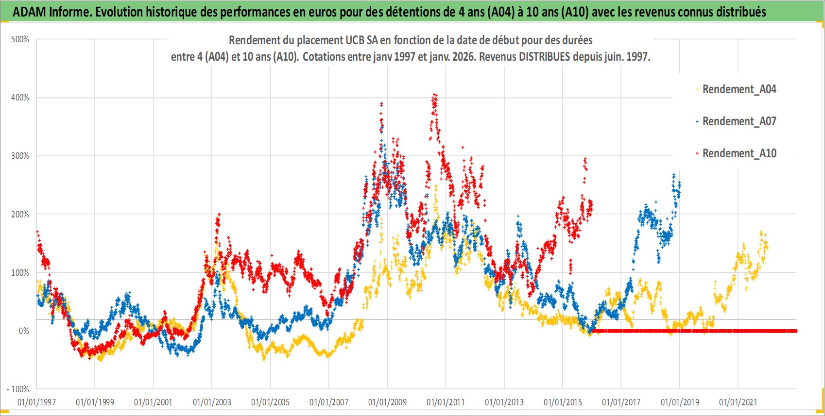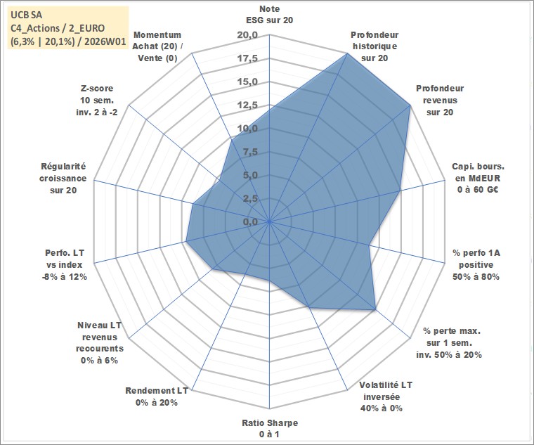 Site dédié aux investisseursPage dédiée sur site financeAnalyse des valorisations hebdomadaires de l'action UCB SA. Cet actif est cote en EUR. Les valorisations couvrent les semaines 1997W01 a 2026W01. Les revenus de cet actif financier sont pris en compte depuis la semaine 1997W26. La note globale ESG de cet actif est estimee a 12.0 (apres rebasage entre 0 et 20).