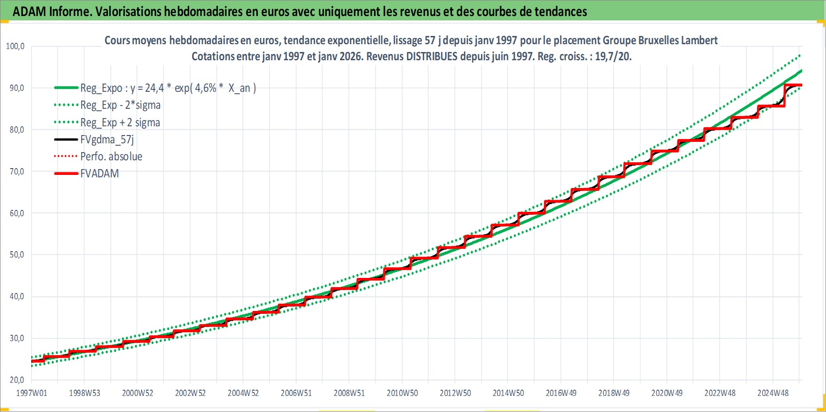 Site dédié aux investisseursPage dédiée sur site financeAnalyse des valorisations hebdomadaires de l'action Groupe Bruxelles Lambert SA. Cet actif est cote en EUR. Les valorisations couvrent les semaines 1997W01 a 2026W01. Les revenus de cet actif financier sont pris en compte depuis la semaine 1997W26. La note globale ESG de cet actif est estimee a 18.0 (apres rebasage entre 0 et 20).