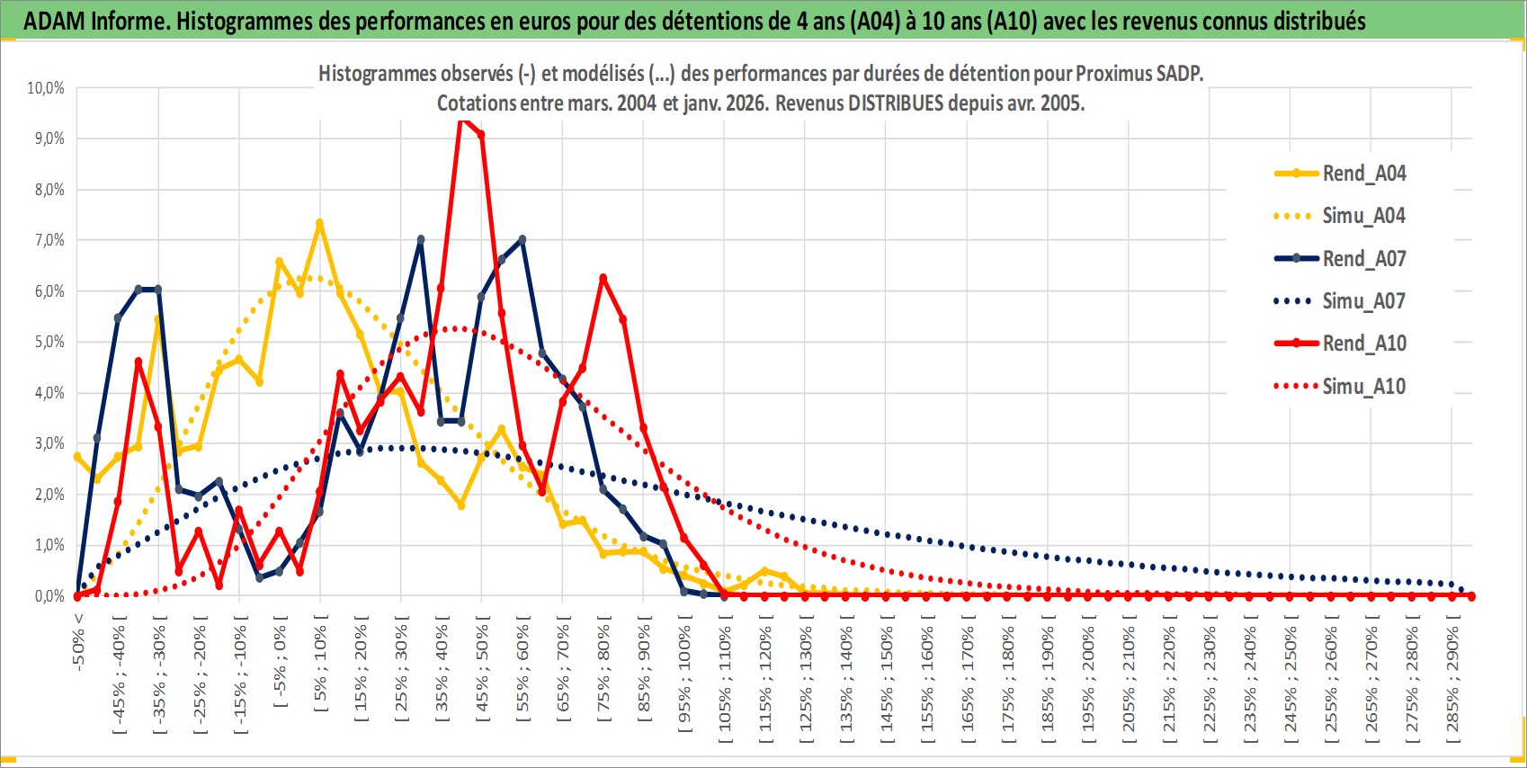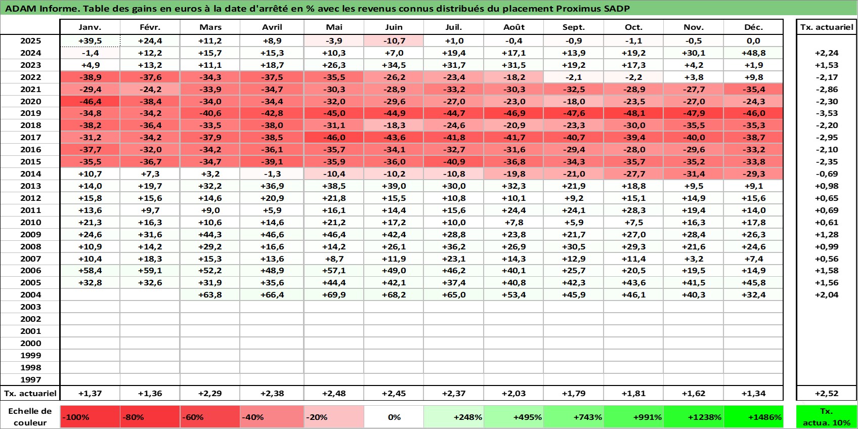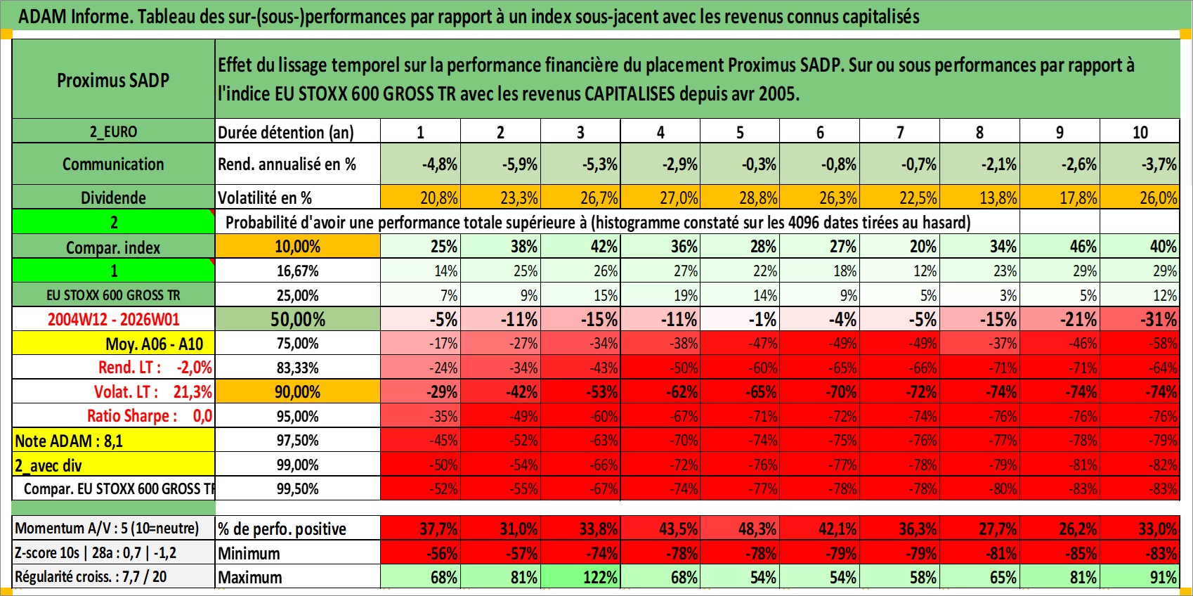 Site dédié aux investisseursPage dédiée sur site financeAnalyse des valorisations hebdomadaires de l'action Proximus SADP. Cet actif est cote en EUR. Les valorisations couvrent les semaines 2004W12 a 2026W01. Les revenus de cet actif financier sont pris en compte depuis la semaine 2005W16. La note globale ESG de cet actif est estimee a 11.0 (apres rebasage entre 0 et 20).