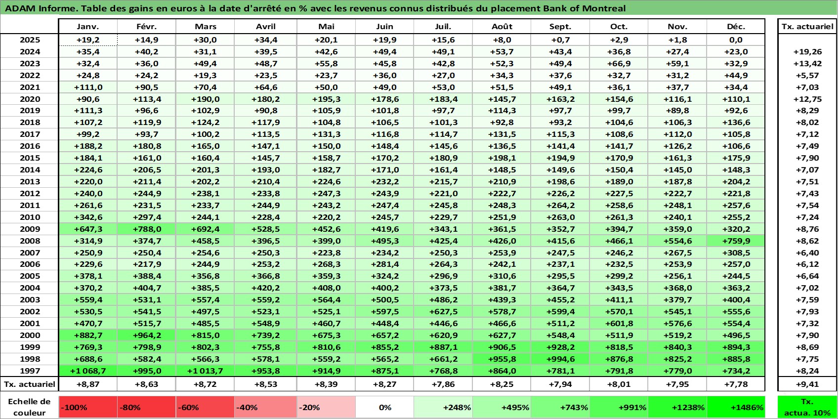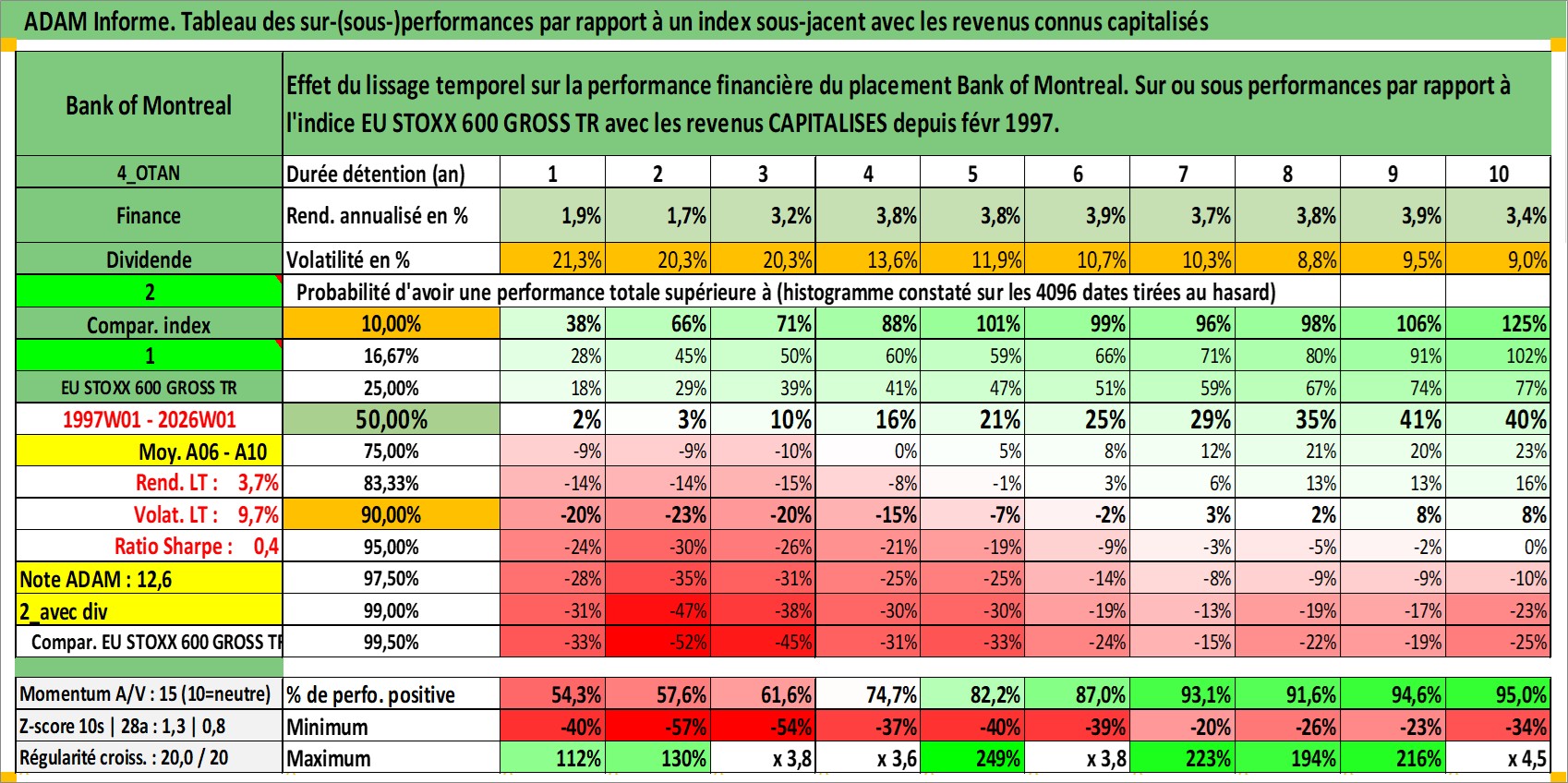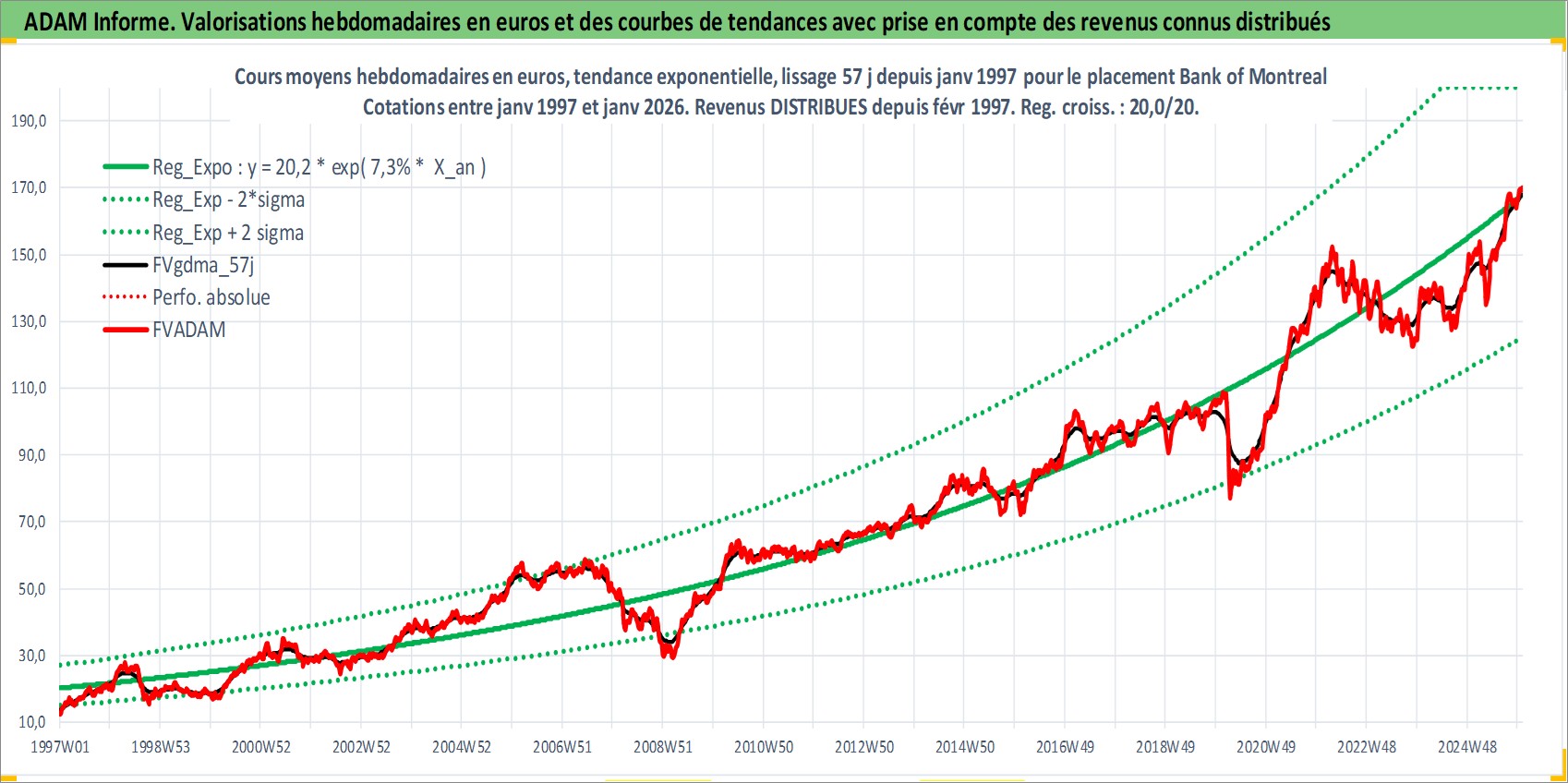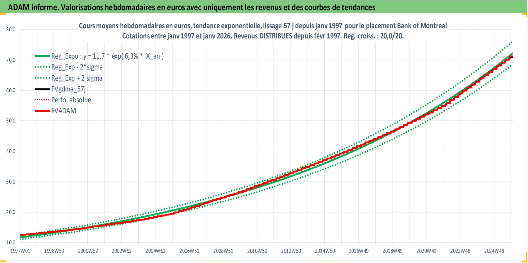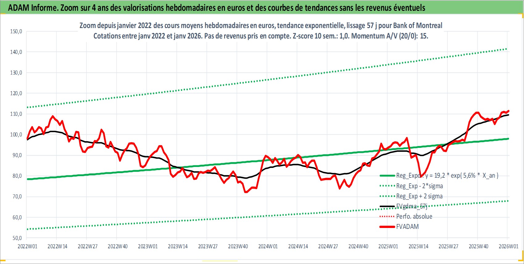 Site dédié aux investisseursPage dédiée sur site financeAnalyse des valorisations hebdomadaires de l'action Bank of Montreal. Cet actif est cote en CAD. Les valorisations sont en contrevaleur EURO et couvrent les semaines 1997W01 a 2026W01. Les revenus de cet actif financier sont pris en compte depuis la semaine 1997W06. La note globale ESG de cet actif est estimee a 11.0 (apres rebasage entre 0 et 20).