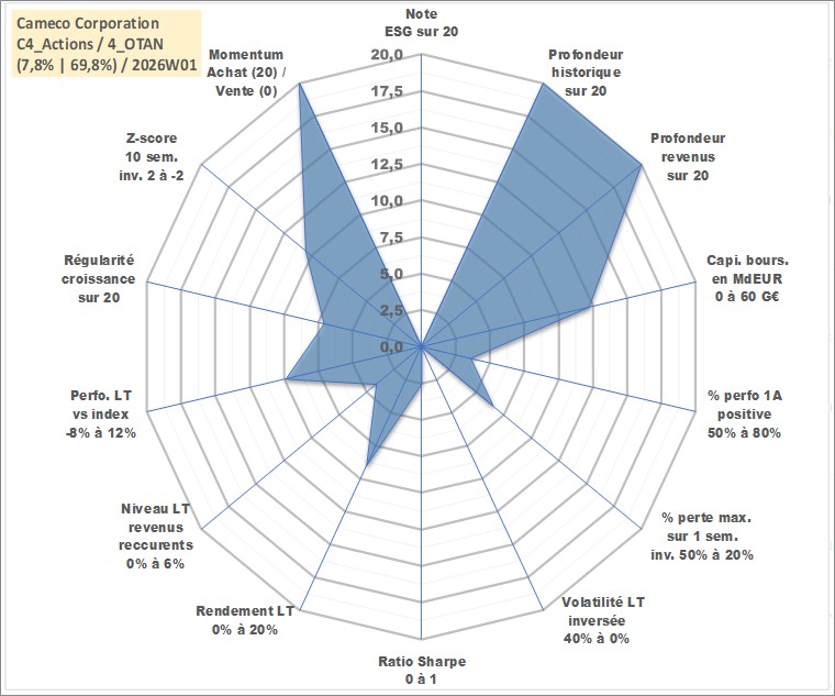 Site dédié aux investisseursPage dédiée sur site financeAnalyse des valorisations hebdomadaires de l'action Cameco Corporation. Cet actif est cote en CAD. Les valorisations sont en contrevaleur EURO et couvrent les semaines 1997W01 a 2026W01. Les revenus de cet actif financier sont pris en compte depuis la semaine 1997W13. La note ESG de cet actif n'est pas connue.