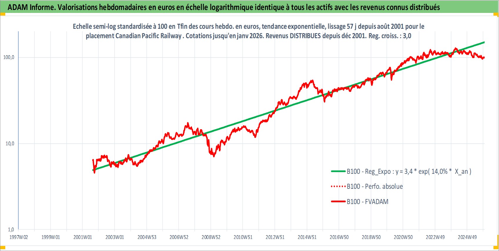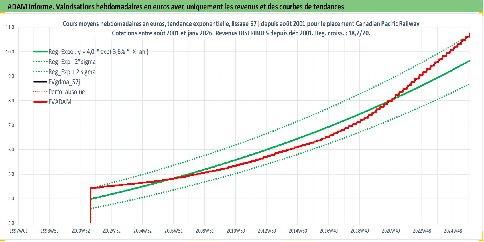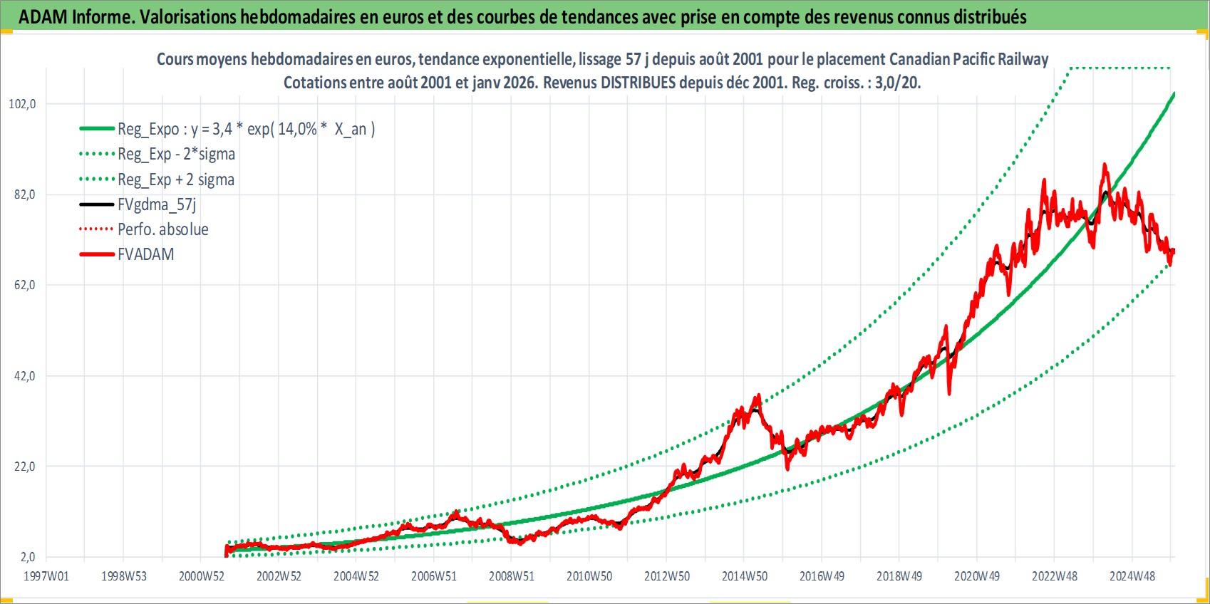 Site dédié aux investisseursPage dédiée sur site financeAnalyse des valorisations hebdomadaires de l'action Canadian Pacific Railway Limited. Cet actif est cote en CAD. Les valorisations sont en contrevaleur EURO et couvrent les semaines 2001W34 a 2026W01. Les revenus de cet actif financier sont pris en compte depuis la semaine 2001W51. La note globale ESG de cet actif est estimee a 12.0 (apres rebasage entre 0 et 20).
