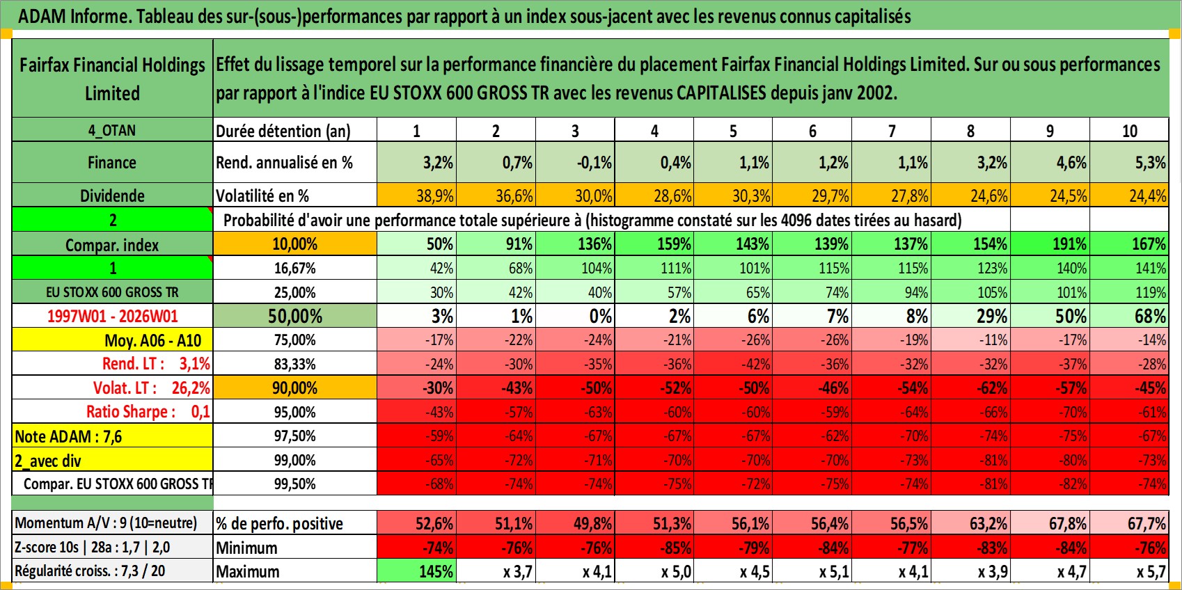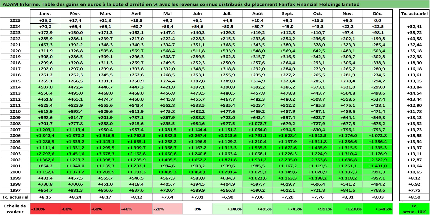 Site dédié aux investisseursPage dédiée sur site financeAnalyse des valorisations hebdomadaires de l'action Fairfax Financial Holdings Limited. Cet actif est cote en CAD. Les valorisations sont en contrevaleur EURO et couvrent les semaines 1997W01 a 2026W01. Les revenus de cet actif financier sont pris en compte depuis la semaine 2002W02. La note globale ESG de cet actif est estimee a 6.0 (apres rebasage entre 0 et 20).
