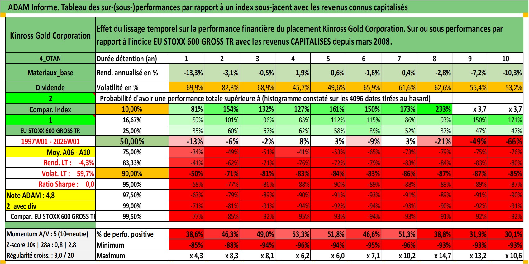 Site dédié aux investisseursPage dédiée sur site financeAnalyse des valorisations hebdomadaires de l'action Kinross Gold Corporation. Cet actif est cote en USD. Les valorisations sont en contrevaleur EURO et couvrent les semaines 1997W01 a 2026W01. Les revenus de cet actif financier sont pris en compte depuis la semaine 2008W12. La note ESG de cet actif n'est pas connue.