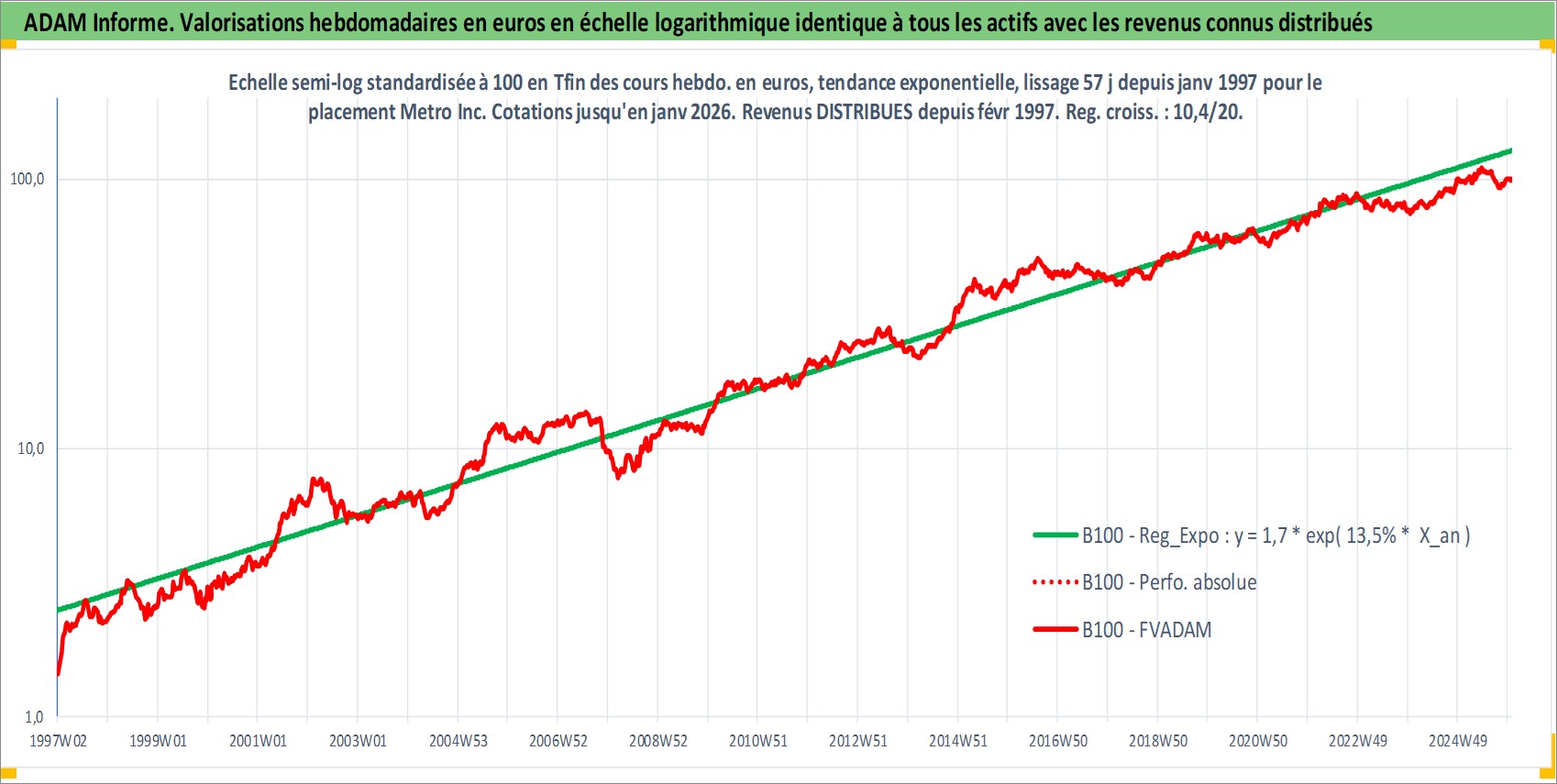 Site dédié aux investisseursPage dédiée sur site financeAnalyse des valorisations hebdomadaires de l'action Metro Inc. Cet actif est cote en CAD. Les valorisations sont en contrevaleur EURO et couvrent les semaines 1997W01 a 2026W01. Les revenus de cet actif financier sont pris en compte depuis la semaine 1997W06. La note globale ESG de cet actif est estimee a 10.0 (apres rebasage entre 0 et 20).