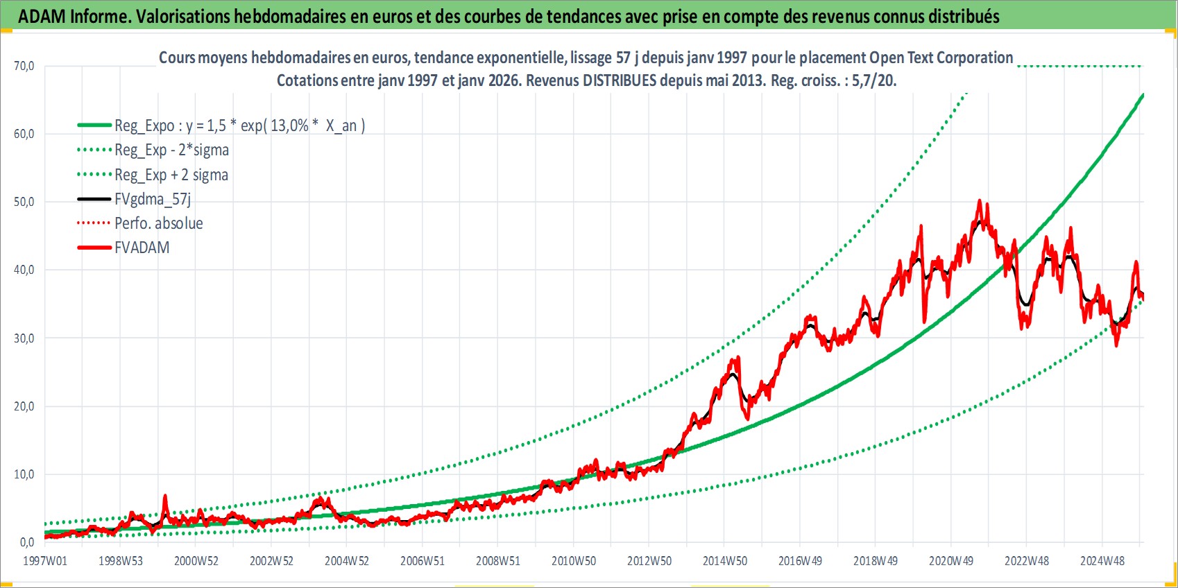 Site dédié aux investisseursPage dédiée sur site financeAnalyse des valorisations hebdomadaires de l'action Open Text Corporation. Cet actif est cote en USD. Les valorisations sont en contrevaleur EURO et couvrent les semaines 1997W01 a 2026W01. Les revenus de cet actif financier sont pris en compte depuis la semaine 2013W22. La note globale ESG de cet actif est estimee a 12.0 (apres rebasage entre 0 et 20).